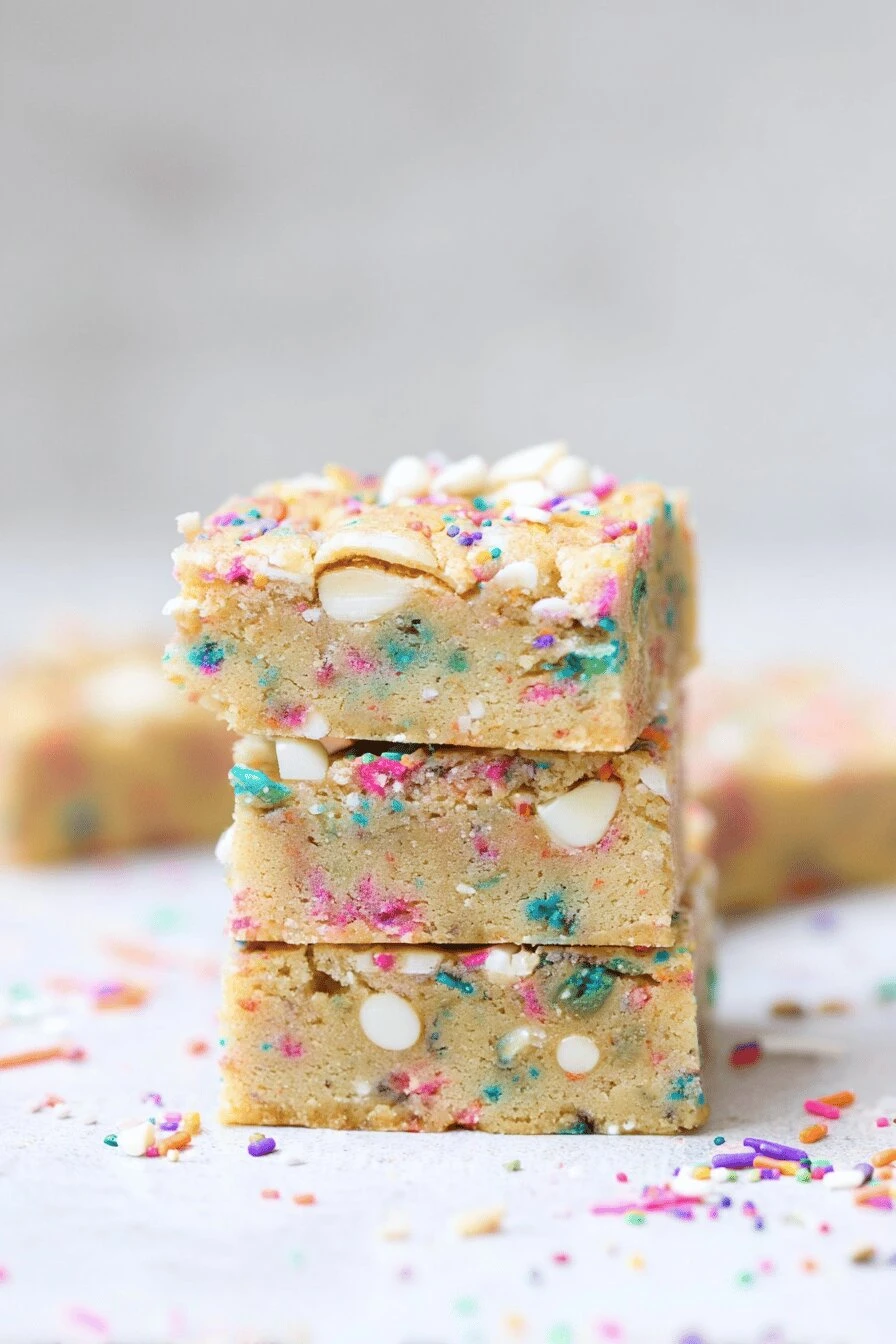 Takes 20 minutes to throw together if you’re not moving slowly, then another 18 in the oven. Means you get dessert before dinner even finishes. Comfort food but less work than actual cookies. One pan. Cut into squares. Done. The texture thing—crispy edges, chewy middle, crunchy Oreo bits on top. Tastes like someone spent time on it. You didn’t. Room temperature stays good for four days. Freeze them wrapped and they last way longer. Works either way. White chocolate and sprinkles make it feel like a party happened. Kids eat these. Adults do too.