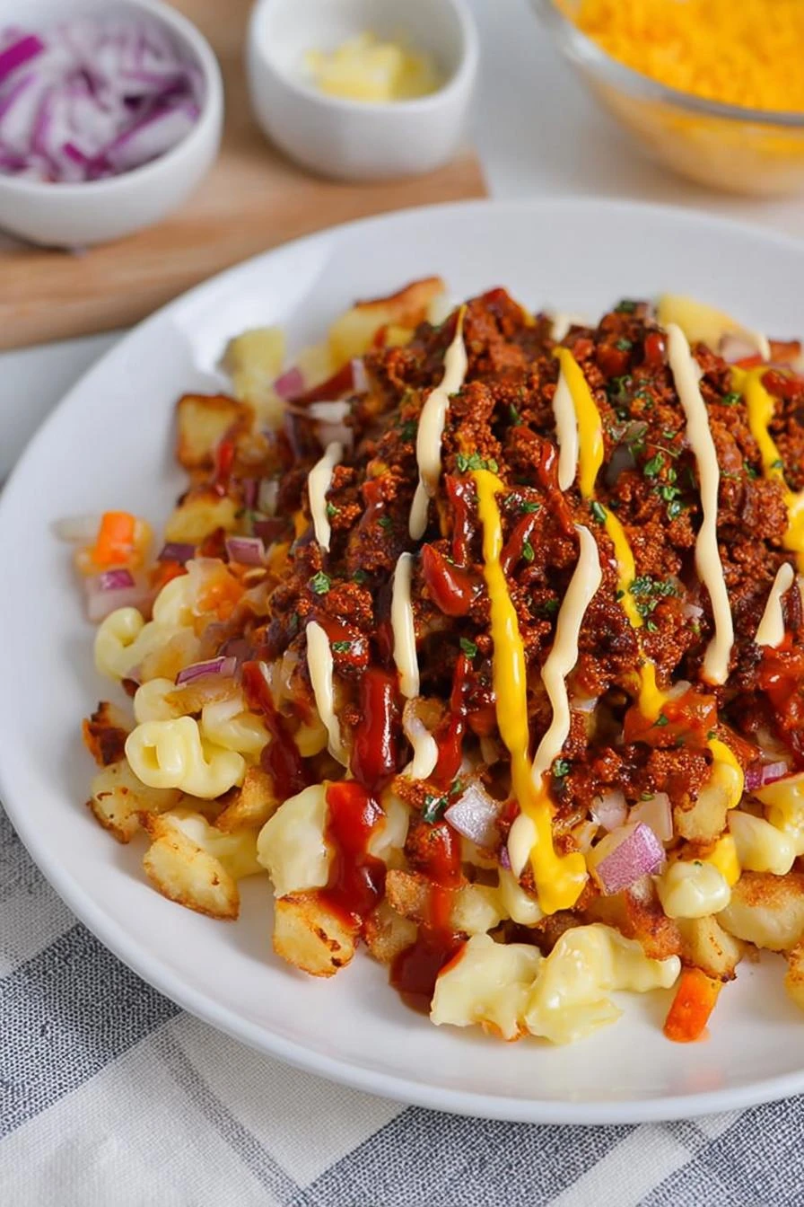 - 4 On each plate, heap a generous mound of home fries on one side. Opposite, scoop a large helping of macaroni salad cold and creamy. Nestle 1-2 burgers near fries, letting cheese meld slightly with potato heat. Scatter sharp raw red onions liberally on top. Drizzle Rochester hot sauce or a smoky spicy blend until it sizzles on hot burger edges. Add pickled jalapeños if you want the kick. Place buttered rye bread slice aside, aroma of toasted rye rounding out heavy plate. Serve immediately; fork dives into crispy, creamy, fiery mash-up. Chaos that somehow works.