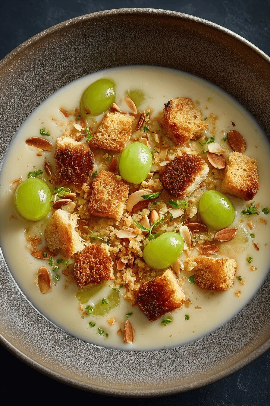 Eighty grams of sliced blanched almonds — not roasted, not whole. The blanched ones puree smoother. A liter of vegetable broth. Stock. Whatever you’ve got. Five garlic cloves, minced fine. Forty-five milliliters of olive oil. Could use a bit less. Could use more. One hundred twenty grams of crustless white bread cubes for the soup itself. Thirty grams of crusty bread, diced smaller, for crisping later. Fourteen green seedless grapes, halved — sounds odd. Trust it. Toasted sliced almonds for the bowl. Smoked paprika. Not regular paprika. The smoky one changes something. Lemon zest. That’s it.