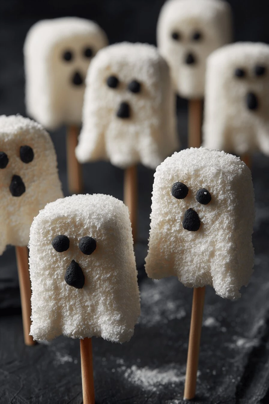 - 10 Use small cone of parchment or tiny piping bag to pipe eyes and mouth onto each marshmallow ghost.