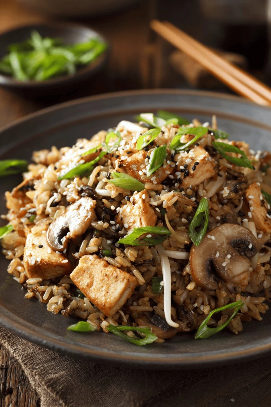 Chicken cubes go in a bowl first. Tamari, maple syrup, toasted sesame oil, ginger—mix that separately. Five minutes marinating, maybe ten. That’s it. Then the pan gets hot. Really hot. Mushrooms first, then chicken, then rice that’s been sitting in your fridge since yesterday. Comes together in 22 minutes, tastes like you spent way longer on it.