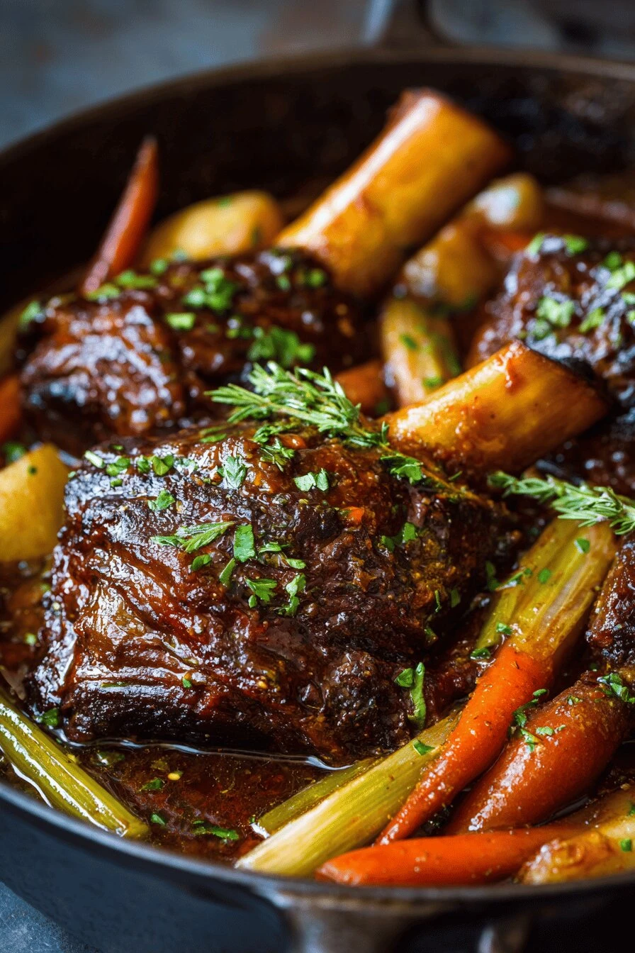 Can you make this in a slow cooker instead of the oven? Yeah. Sear the shanks on the stovetop first—that step doesn’t change. Then everything goes into the slow cooker on low for eight hours. Add the vegetables after four hours or they’ll disintegrate. The glaze won’t be as thick because there’s no reduction happening, but you can boil it down on the stove after if it matters to you.