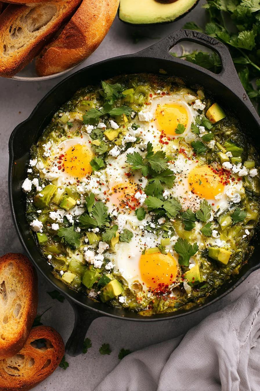 - 8 Finish with crumbled feta, creamy avocado slices, a handful of fresh cilantro or microgreens. Sprinkle red chili flakes or hit with hot sauce for kick. Serve straight from skillet with toasted baguette, pita or rustic bread to mop flavorful juices.