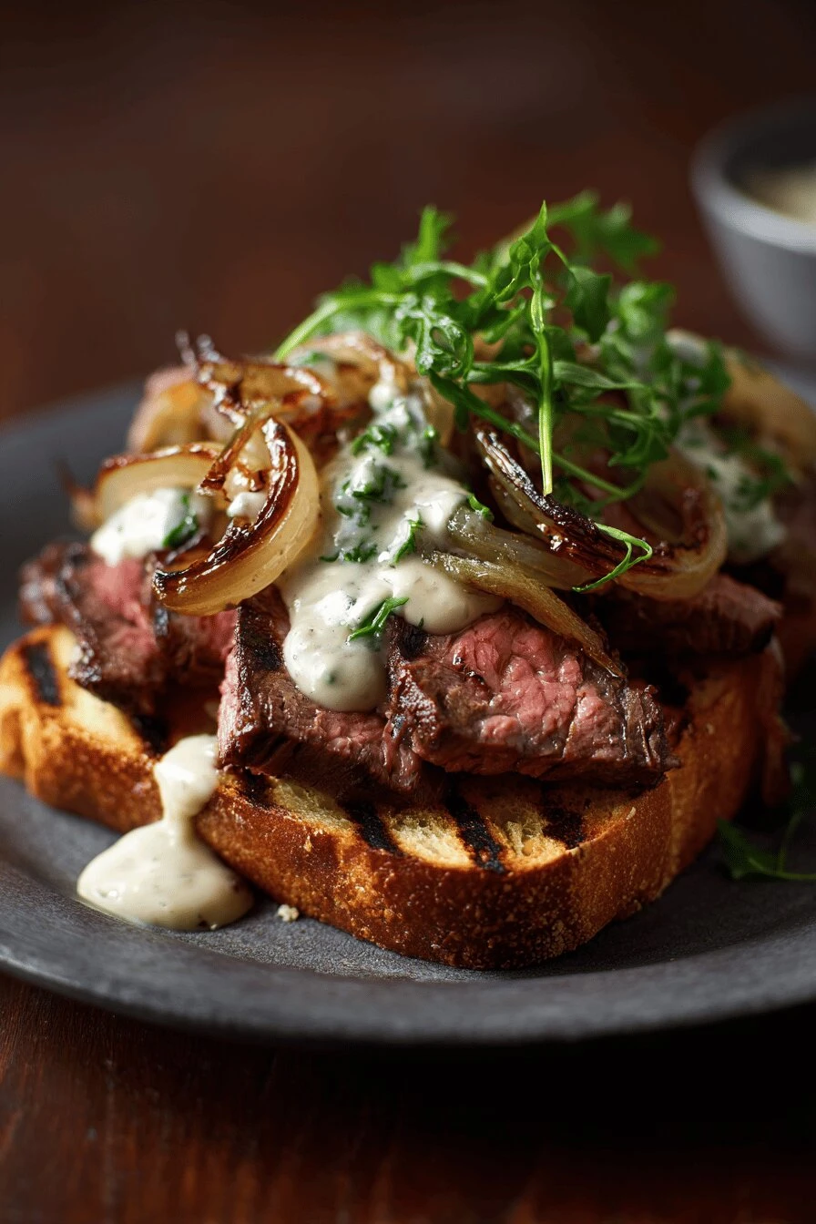 - 13 Spread mustard cream sauce on grilled bread side generously, pile caramelized onions over two slices, add sliced steak, top with drained pickled fennel. Sprinkle fresh fennel fronds for aroma and texture. Close sandwiches, slice in half, serve immediately with extra pickles if liked.