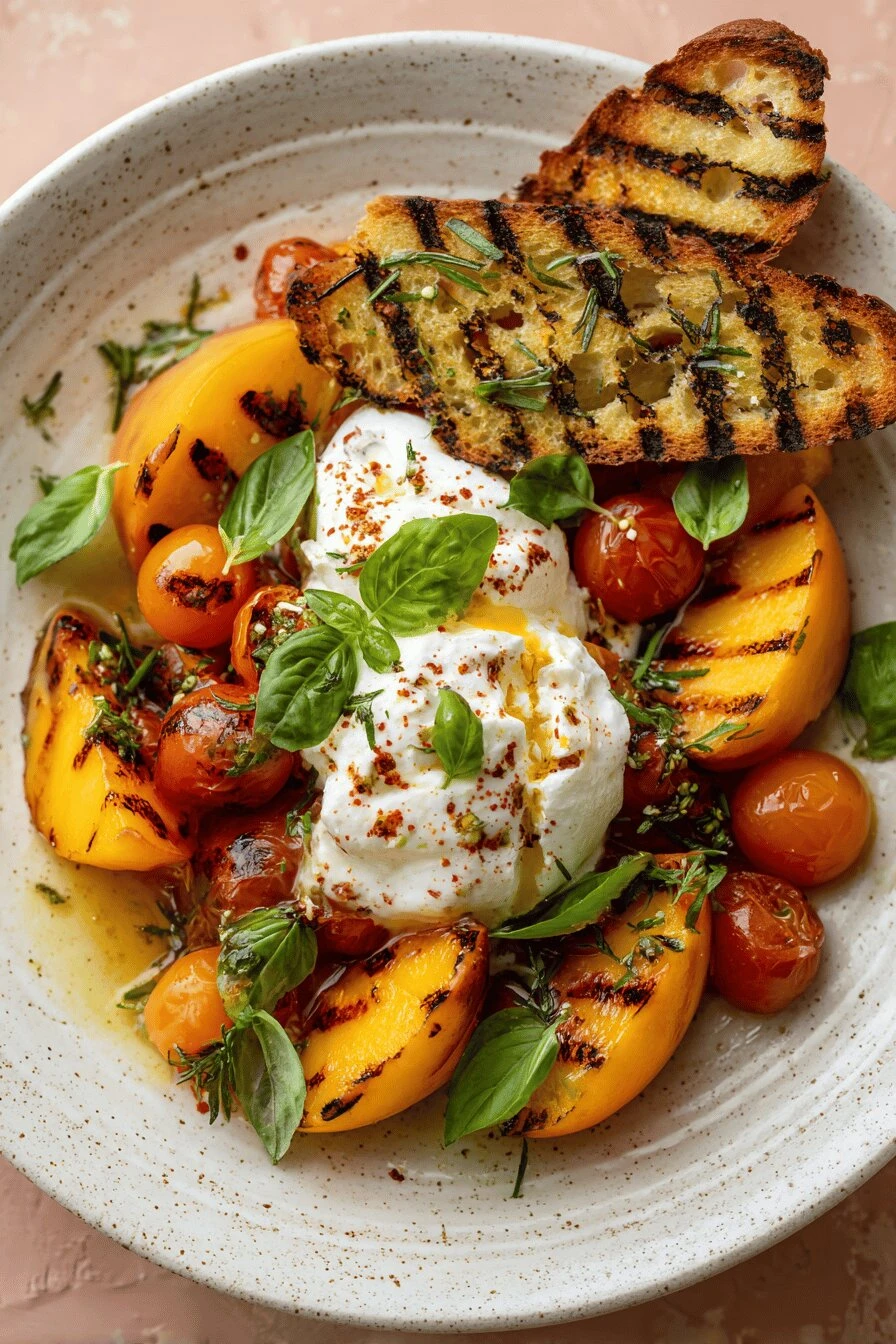 Takes 35 minutes total—20 minutes of prep, 15 on the grill. Summer entertaining, done. Vegetarian grilling that actually works. Not a side dish trying to be important. This is the main event. Burrata cheese goes soft in the heat. Honey pools around it. Basil scattered everywhere. Warm fruit, creamy center, crispy toast with garlic. It all happens at once and it works. The confit cherry tomatoes cook in foil. Smoked paprika gives them something deep. You’re not fighting heat or flare-ups. Just time and gentle temperature. Cleanup’s minimal too—everything’s wrapped. Cold peaches won’t work. They’ll split. Ripe ones that yield slightly when you press them. That’s the moment.