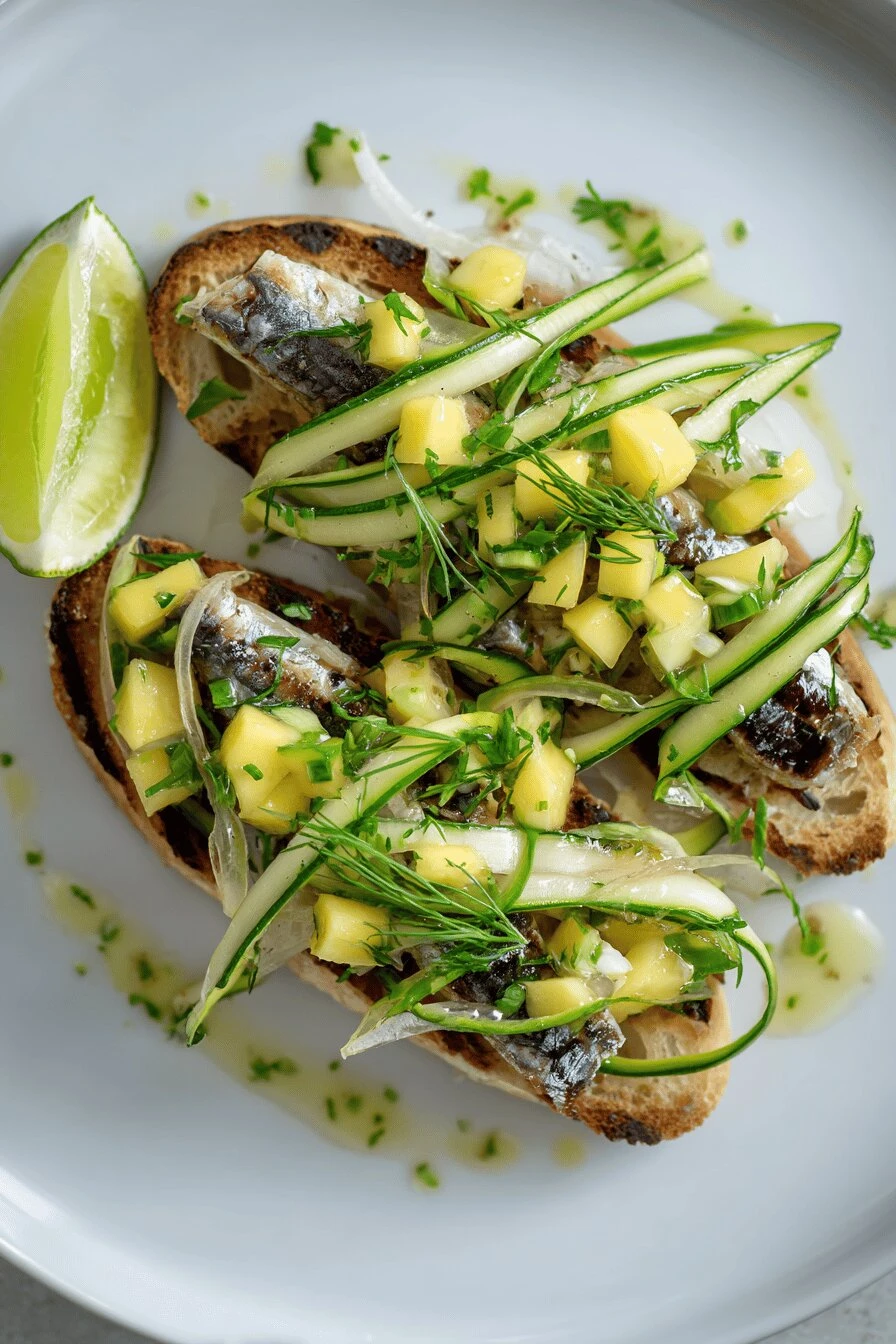 - 4 Scatter grilled zucchini ribbons atop bread, arrange diced tart mango over this, salty sardines layered on next. Reserve some sardine oil to drizzle if needed.