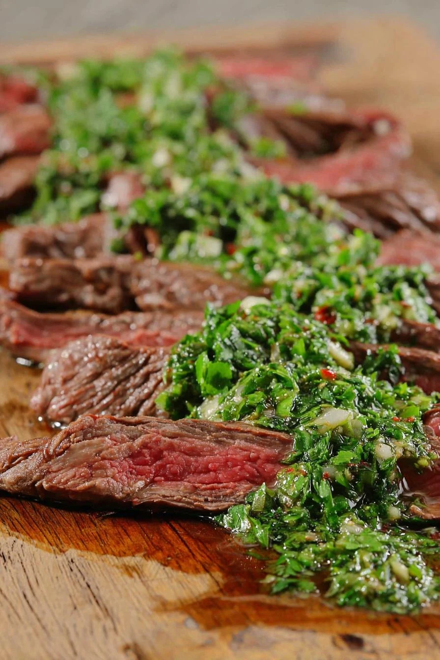 After resting, slice thin against the grain. Skirt steak’s got a short grain, so this isn’t complicated. Across the fibers instead of parallel. Makes it tender, makes it easy to eat. Takes maybe two minutes. Then plate it and immediately top with chimichurri or salsa verde while the meat’s still warm. Herbs pop when they hit heat. Acid from the herbs cuts through the richness. That’s the whole thing.