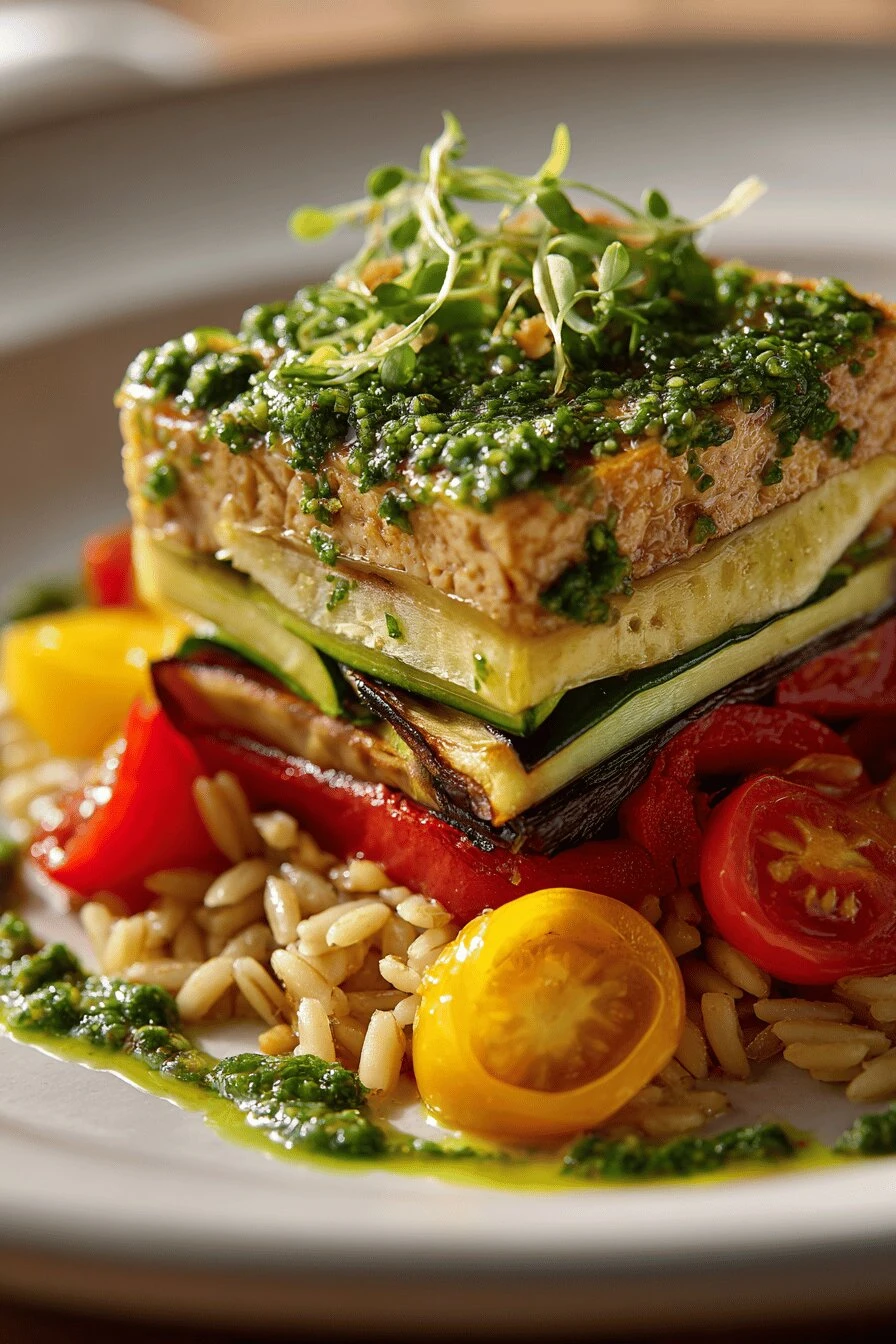 On each plate, stack 3 tofu slices. Alternate with spoonfuls of the orzo salad between them. Press lightly so it stands but stays fluffy. Pour the herb-citrus emulsion around and over generously. The sauce matters here. Don’t skimp.