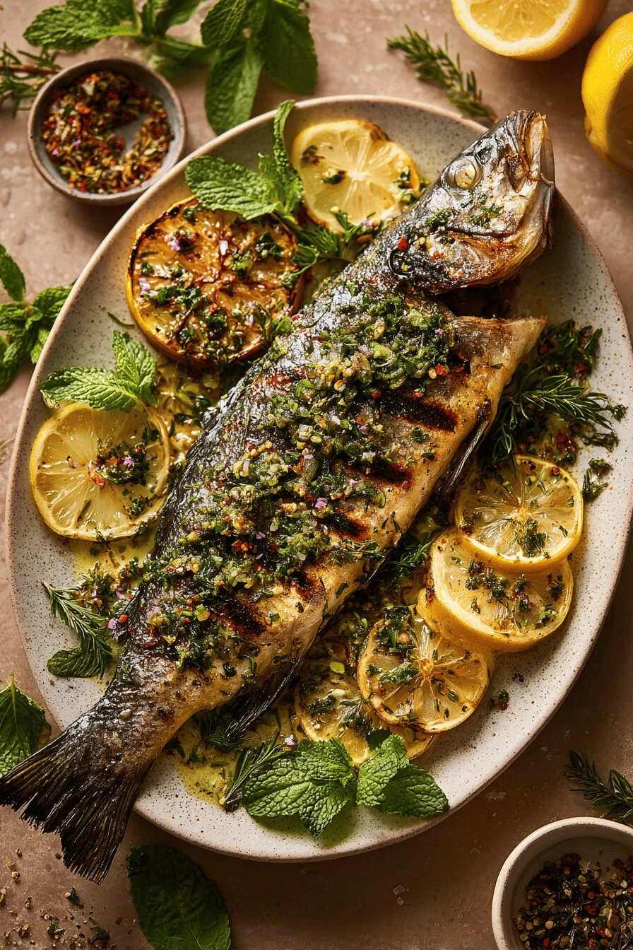Takes 40 minutes total. Most of that’s the fish sitting there doing its own thing while you stand around with a drink. Tastes like Mediterranean restaurant food but you made it in your backyard. Lemon and herbs infuse from the inside out—skip the stuffing and you lose half the flavor. Works for weeknight dinner or feeding people. One fish per plate. Looks impressive without being complicated. The skin gets crispy. Actually crispy. Not soggy. It’s the scoring that does it—heat penetrates, flesh stays tender, skin shatters when you bite it. Fresh herb heavy but doesn’t taste medicinal. Basil, dill, thyme, parsley all going at once should be too much. Isn’t.
