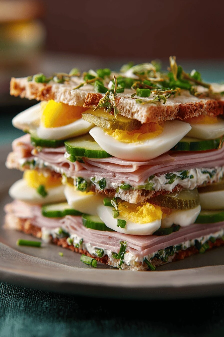 No cooking. Seriously, the eggs are already done. Takes thirty minutes start to finish, most of it just chopping herbs and not even fast chopping. Works cold. Works the next day. Works wrapped or on a plate. The cornichon thing—sounds weird, tastes sharp and bright without being aggressive about it. Cream cheese holds everything together so it doesn’t fall apart on your hands like regular sandwiches do.