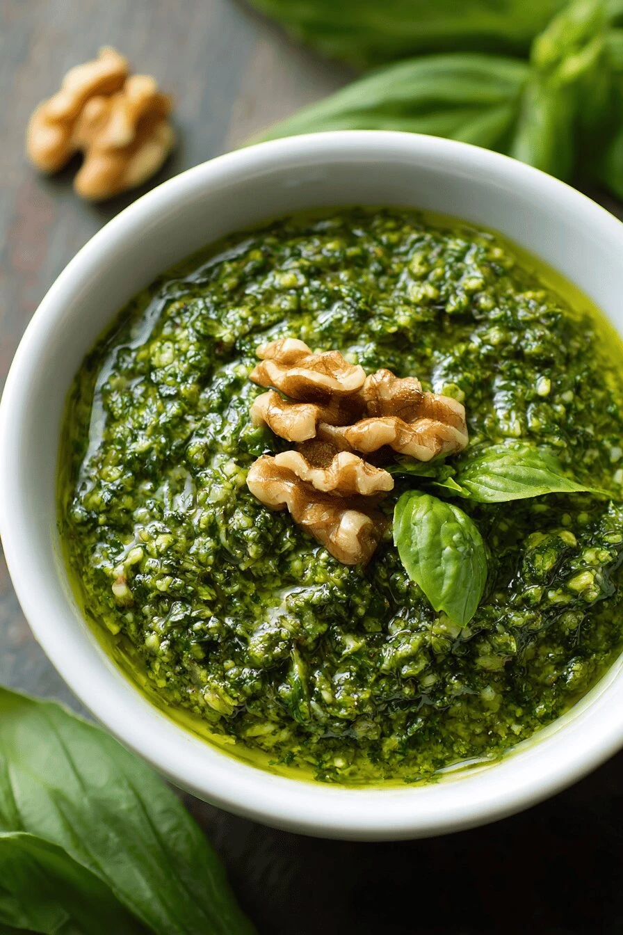 Makes actual condiment out of what’s in your garden or the produce section. Not some precious thing. Just works. Cold pasta, warm pasta, doesn’t care. Dollop it on fish. Stir into Greek yogurt. Spread on garlic bread and you’re basically done with dinner. Walnut pesto tastes nuttier than the traditional version—toasted ones especially. Vegetarian and dense enough that a little goes a long way. Oil separates sometimes when it sits. Just whisk it back. Not a flaw.