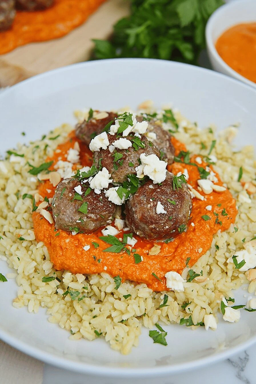 Takes 50 minutes total—25 to prep, 25 to cook. Easy enough for a weeknight. Ground lamb with oregano and garlic tastes like something from a Mediterranean kitchen without needing three hours or a ton of skill. Buttered orzo soaks up everything. Romesco sauce brings smoke and depth. Feta crumbled on top—salty, creamy, cuts through the richness. And you get texture: crunchy almonds scattered over the whole thing, soft meatballs, pasta with actual butter coating it. Leftovers work cold or reheated.