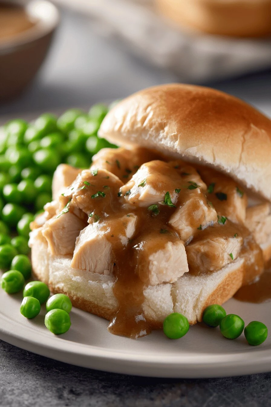 Chicken broth. Three quarters of a cup. Or water, honestly. Water works the same way. Frozen peas. About half a cup. Don’t thaw them first. Diced cooked chicken. Warm. Two cups. Could be rotisserie, leftover, from whatever. Still warm is better but cold works too. Hot brown sauce. One batch. This is where the whole thing lives. Not the sauce, you don’t have a sandwich. Eight sandwich buns. Split. Oval or round, doesn’t matter. White bread slices work if you don’t have buns. Just need something to hold the sauce.