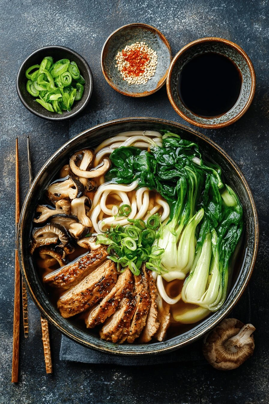 Low-sodium chicken stock. Nine hundred milliliters. Not the salty kind. Concentrated beef broth from a can. Two hundred milliliters. The condensed stuff actually tastes better here than the box version. Soy sauce. Fifteen milliliters. Just enough to darken it slightly. Fresh ginger. A three-centimeter piece, peeled, sliced thin. Gets the aromatics going fast. Kombu kelp sheet. Five by five centimeters. Six minutes in the broth, then out. Overstay and it gets bitter. Daikon radish. One medium. Peel it, slice into matchsticks about six centimeters long. The texture matters—crunchy when it hits the bowl. Pork shoulder sliced thin. Five hundred grams. Already sliced. Just ask the butcher. Don’t try to slice it yourself when it’s cold. Udon noodles cooked. Two hundred fifty grams. Toss lightly in sesame oil so they don’t stick. Shiitake mushroom caps. Two hundred twenty-five grams. Cleaned, not washed. Brush them with a paper towel. Baby bok choy leaves. Thirty grams. Whole leaves. They cook in seconds. Scallions cut into five-centimeter lengths. Two of them. Ponzu sauce mixed with fresh grated ginger. That’s your dipping sauce. Wasabi optional. Most people skip it. Some people add it. Both are fine.