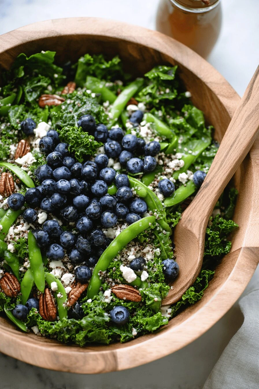 - 5 Add bulgur, blueberries, nuts, snap peas, and feta to kale bowl. Toss gently with remaining dressing. Taste for seasoning; adjust salt and pepper. Serve immediately or chill briefly. Keeps well, but best fresh to avoid sogginess.