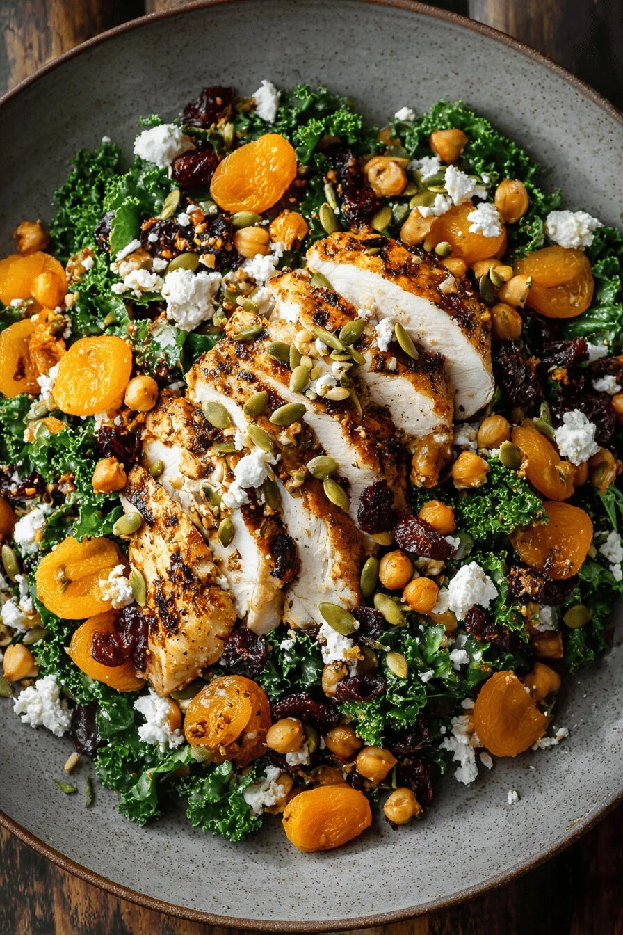 Add kale, chickpeas, pumpkin seeds, goat cheese to the bowl. Fold in the warm chicken last. Fold gently—you want the cheese to stay chunky, not break apart into nothing. The warmth of the chicken wilts the kale slightly, helps the flavors marry faster. Taste it. Adjust salt and pepper with actual confidence. More lime if it needs brightness. Pinch more chili if it needs edge.