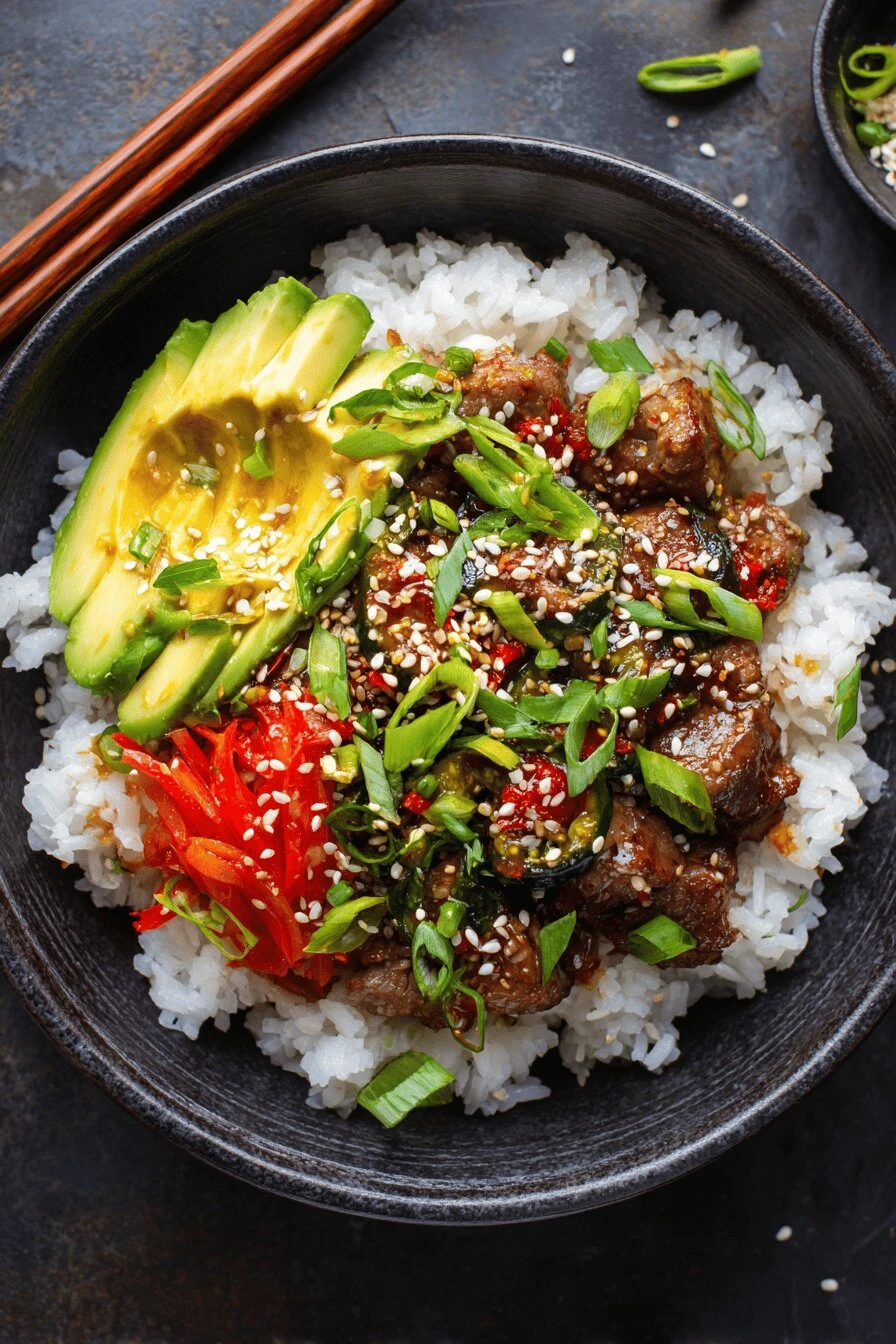 - 4 Divide rice evenly into four bowls. Spoon pork over rice, including any juices, glossy coating important. Neatly pile pickled carrots and cucumbers to one side for contrast. Add avocado slices around edge or on top for creaminess that cools heat. Sprinkle with sliced green onions and toasted sesame seeds liberally. Serve immediately. The pork juices soak rice, blending savory heat with cool, tangy fresh crunch and buttery avocado.