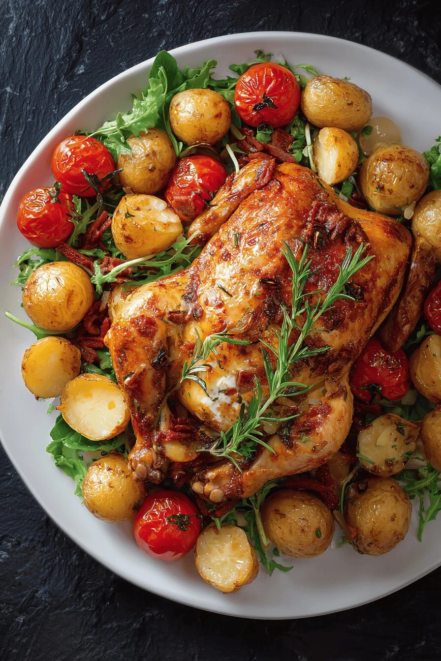 - 7 Remove pan, tilt slightly to gather pan juices. Spoon over bird, potatoes, and tomatoes. Let rest at least 10 minutes before carving — keeps juices in meat, allows flavors to settle. Serve with sharp green salad as counterpoint.