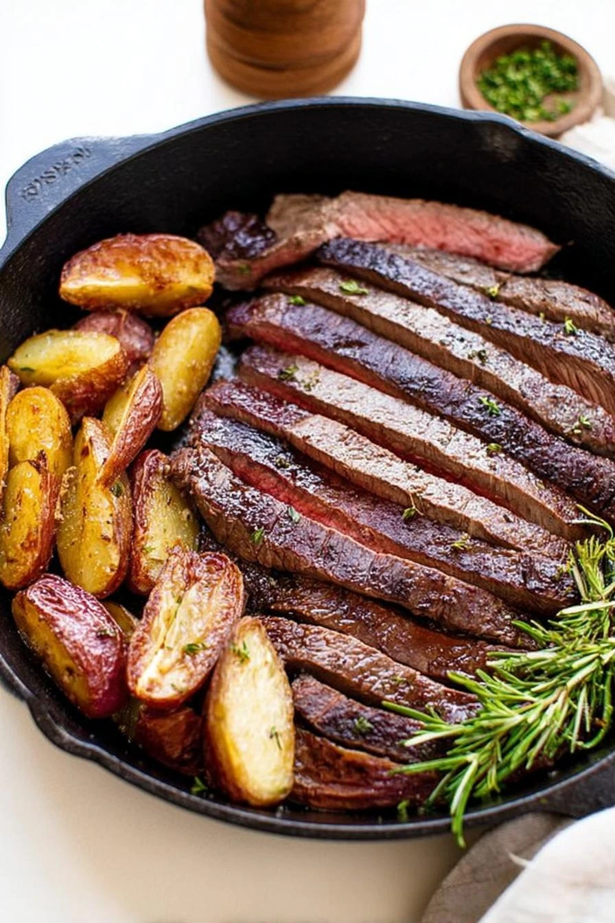 - 4 Wrap steak loosely in foil and let rest 8 to 10 minutes. Critical step: redistributes juices, avoids dry edges. When slicing, find grain direction and cut sharply against it; short fibers mean tender bites. Slice about 1/4 inch thick. Serve immediately with potatoes.