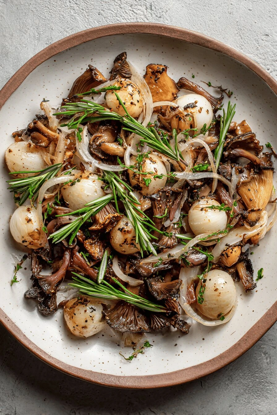 Pearl onions — peeled already if you can find them. Peeling them yourself is its own nightmare. Oyster mushrooms. Cremini. Either works, or both. The oysters get crispier. The creminis stay more substantial. Both is better. Olive oil. Good kind. Not amazing, just not the cheap stuff that tastes like nothing. Balsamic vinegar — aged if you have it. Regular works. The aged stuff tastes deeper somehow. Mustard seeds and coriander seeds. Toast them yourself for like two minutes. Pre-toasted is fine too. Fresh rosemary. Dried dies in this. Don’t bother. Salt. Cracked pepper. Matters more than you’d think.