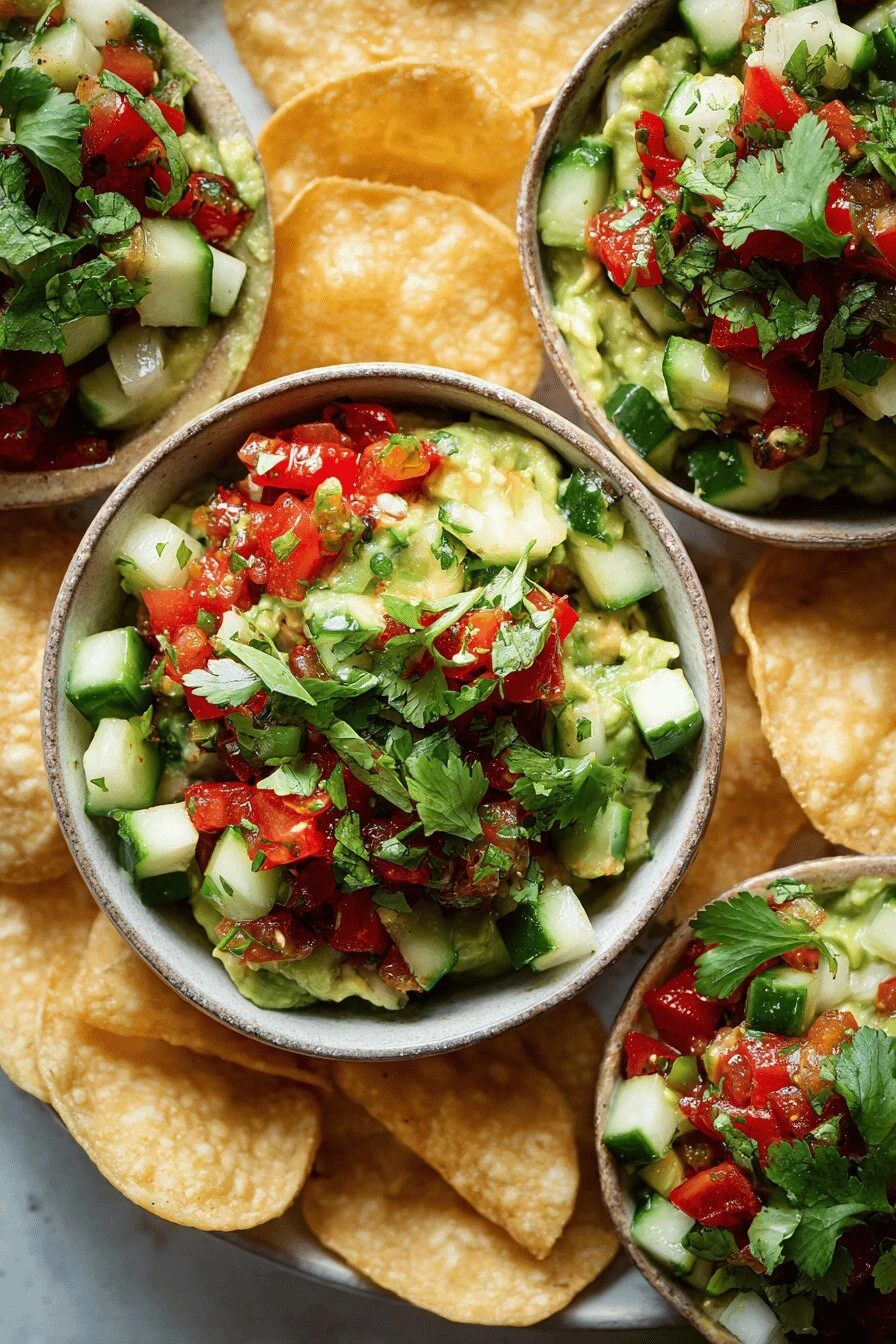 - 7 Serve immediately or within 10 minutes or chips soften, no later; no reheating. Visual cue: chips stay crisp, guac glistens, cucumbers firm. If chips lose crunch, swap for fresh ones.