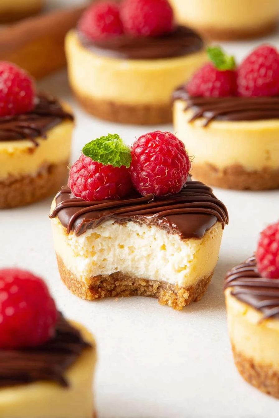 Takes 25 minutes to make, then patience does the rest. Silky centers that actually stay silky — no cracks, no dryness, just creamy. Chocolate ganache on top because why not. Fresh raspberries because they’re there. Graham cracker crust that stays firm instead of turning into paste. Make them Friday, eat them through Sunday. Freezes stupidly well if you skip the ganache first.