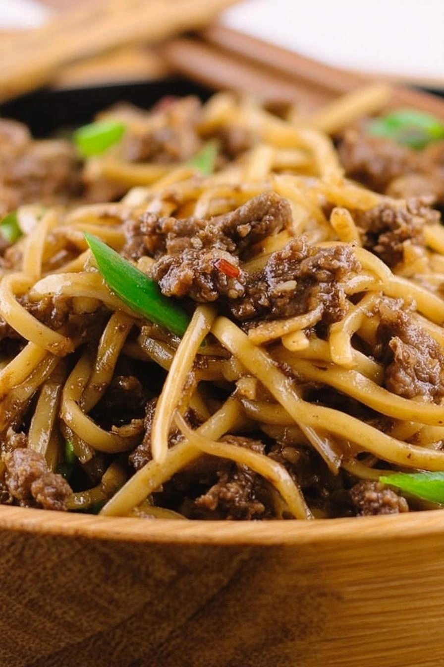Eight ounces of wide egg noodles work best here — they hold sauce better than thin ones. Rice noodles work too, spaghetti even. A pound of ground beef. Ground turkey if you’re going lighter, though it loses some of that savory depth. Sesame oil — not the cheap stuff. Two teaspoons each of garlic paste and ginger paste. One and a half tablespoons of chili paste. Swap it for sriracha or chili garlic sauce if that’s what you have. A quarter cup soy sauce, low sodium fine. Brown sugar. Three tablespoons. Hoisin sauce — oyster sauce works, so does a mix of plum sauce and soy if hoisin isn’t around. Beef broth. A cup total, divided. Cornstarch. Half a cup to a cup of green onions. Sesame seeds if you want the crunch.