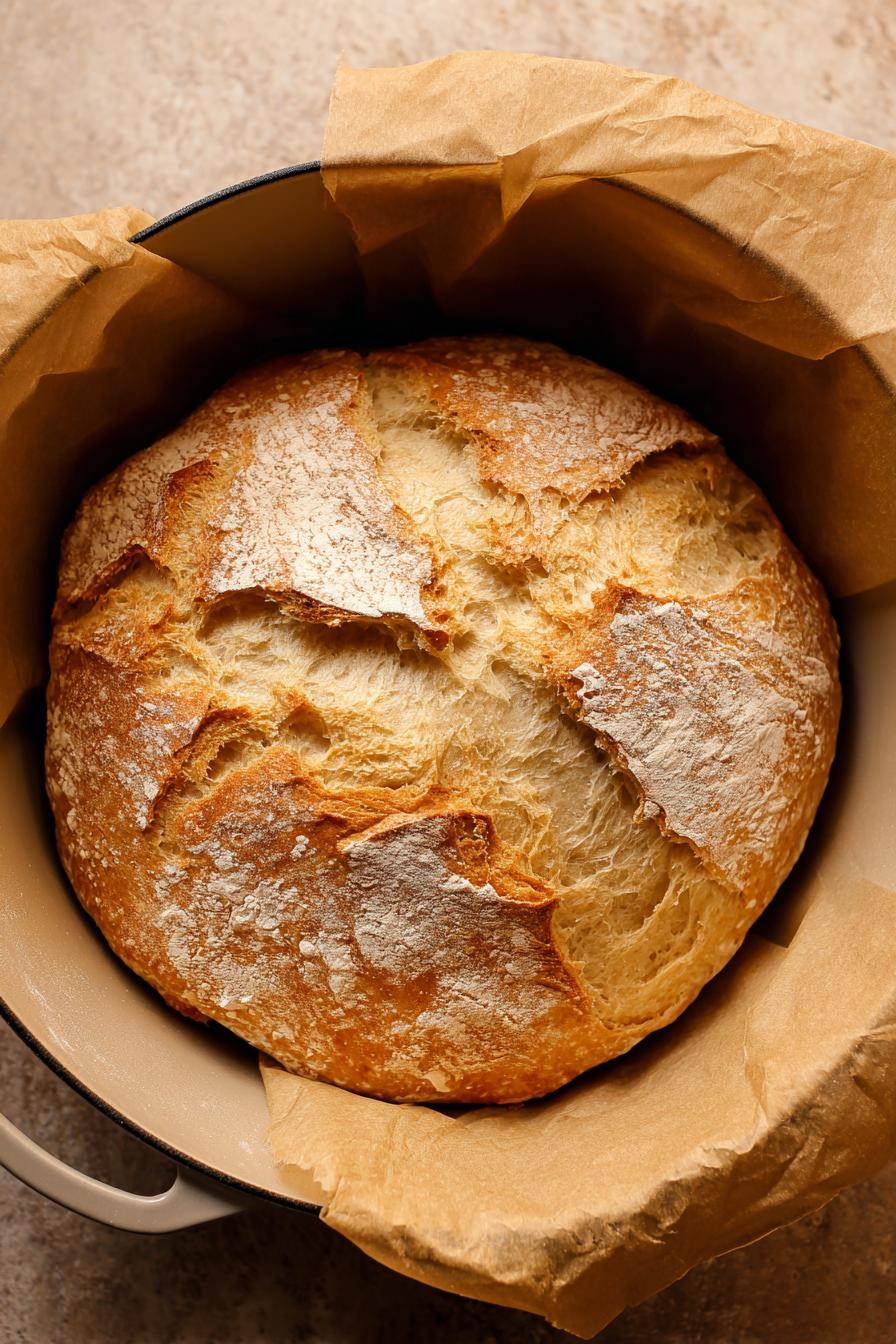 - Use tongs or stiff spatula to carefully lift bread from Dutch oven by parchment corners. Place on wire rack. Don’t skip this step or loaf will steam-gunk bottom, losing crispness. Cool at least 15 minutes—crumb needs to set; cut too soon and you’ll get gluey interior. Butter melts best at this stage.