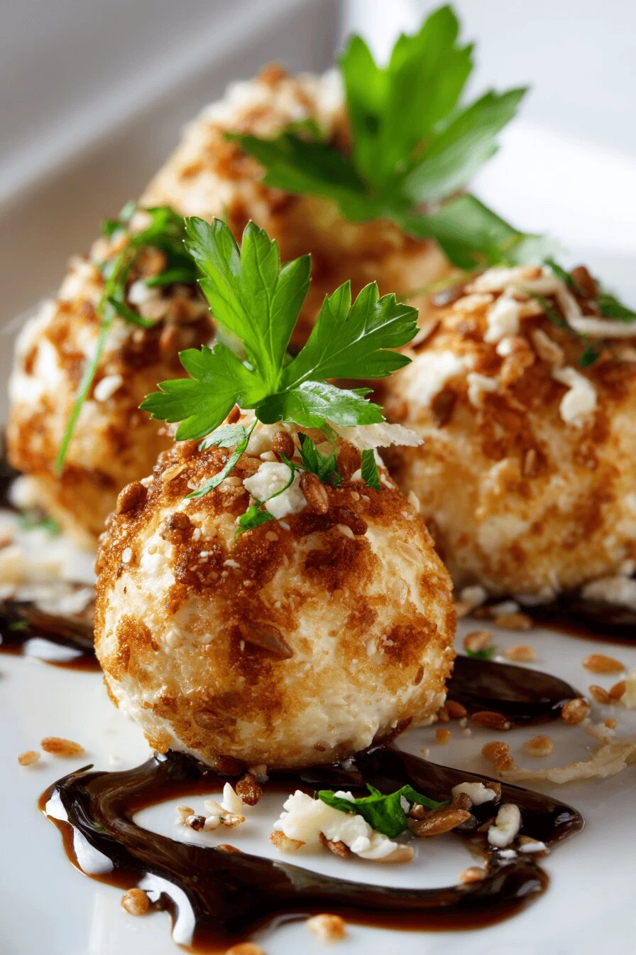 - 4 Place cheese balls one by one in shallow serving dishes with a small ladle. Don’t crowd, sauce drowns balls if overpoured. Drizzle white balsamic reduction in thin lines or dots across, the sharpness cuts through creamy richness. Garnish with fresh chervil sprigs for brightness and color contrast. If sauce chills too firm, warm gently to syrupy pour.