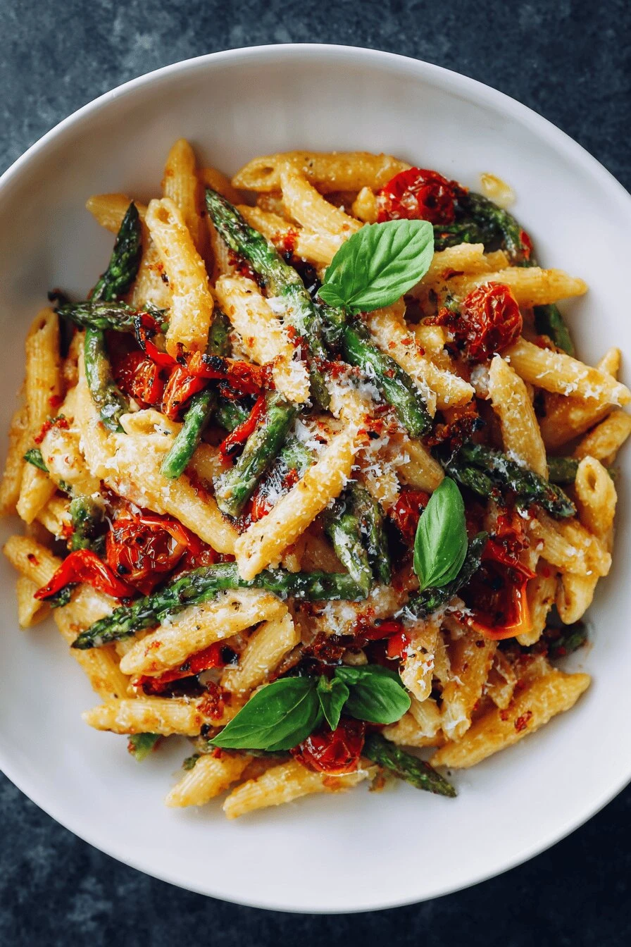 When there’s about two minutes left on the pasta, dump your asparagus and tomatoes in the same pot. They cook in that same water, same heat. The asparagus stays bright green and snappy. The tomatoes soften but don’t explode.