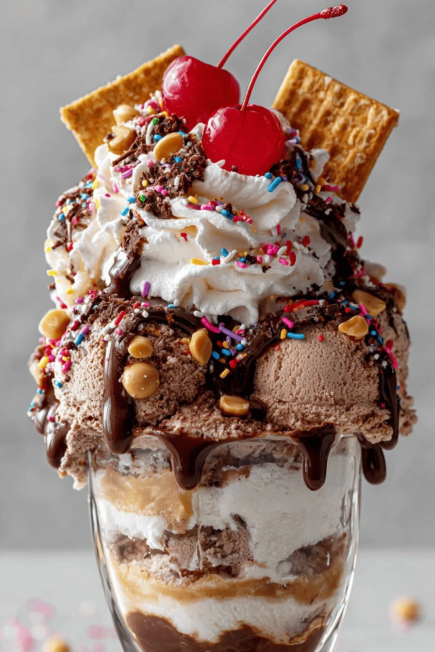 - 13 Spoon some warm peanut butter fudge into bottom of sundae glass. Layer with one large scoop ice cream. Drizzle extra sauce over. Add second scoop. Finish with shards, dollop whipped cream, cherries, pirouline wafers, and colorful sprinkles if desired.
