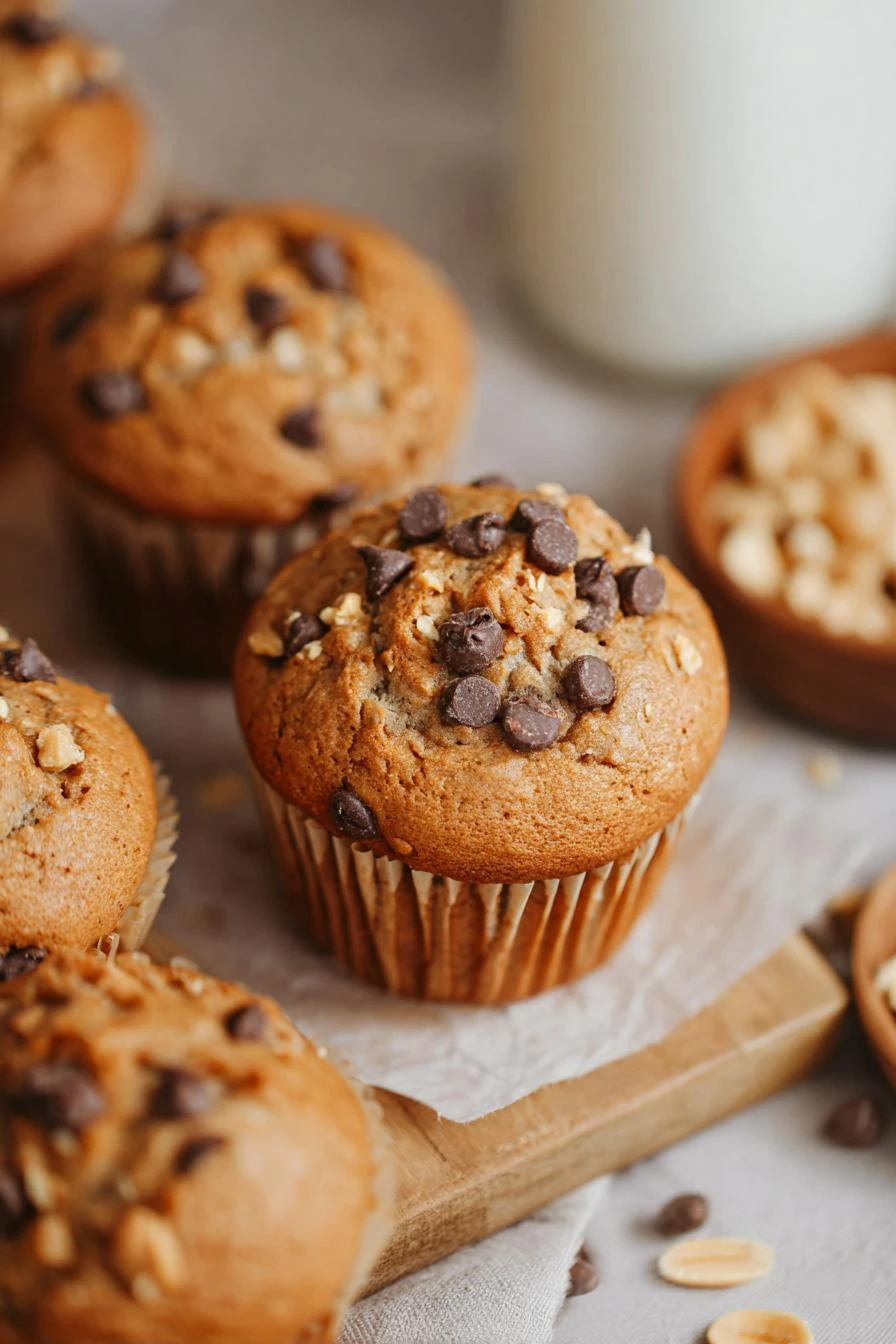 All-purpose flour and oat flour mixed. The oat adds something soft. Not a lot—just a quarter cup. Baking powder and baking soda. Both. Not one or the other. Salt. Half a teaspoon. Sounds small. Changes everything. Milk. Three quarters cup. Whole milk works fine. Two percent also works. Peanut butter. Natural. The kind where oil sits on top. Stir that oil back in. Looser texture, better crumb. Brown sugar and white sugar. A quarter cup each. Brown gives moisture and depth. White keeps it from being too heavy. Vegetable oil. A third cup. Not olive. Neutral matters here. Two eggs. Large. They bind everything. Vanilla. A teaspoon. Mini chocolate chips. Three quarters cup in the batter plus more for topping. Don’t use regular chips—they’re too big and break the crumb. Crushed roasted peanuts. Two tablespoons on top. Unsalted. Salted works but it’s a lot.