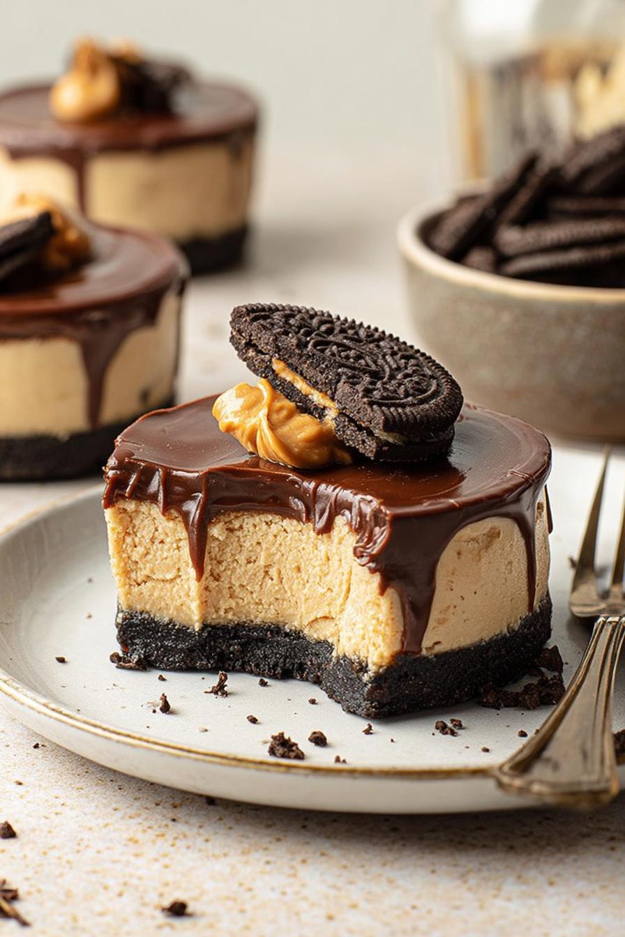 - 17. Serve cold. Soft creamy peanut butter filling with slight Oreo crunch in crust and shiny chocolate cap. If ganache sticky or dull re-melt gently and reset for shine.