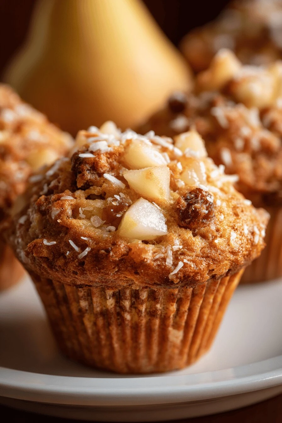 Breakfast muffins that don’t taste like cardboard. The cream cheese filling melts into the crumb and just stays there, sweet and tangy. Makes 12. Grab one cold from the tin. They’re actually better that way. Snack-worthy. Coconut gives them texture. Pear and dates do the sweetness, so you don’t have to oversweeten the batter. The filling—maple syrup mixed into softened cream cheese—tastes like you planned this for hours. Took maybe two minutes.