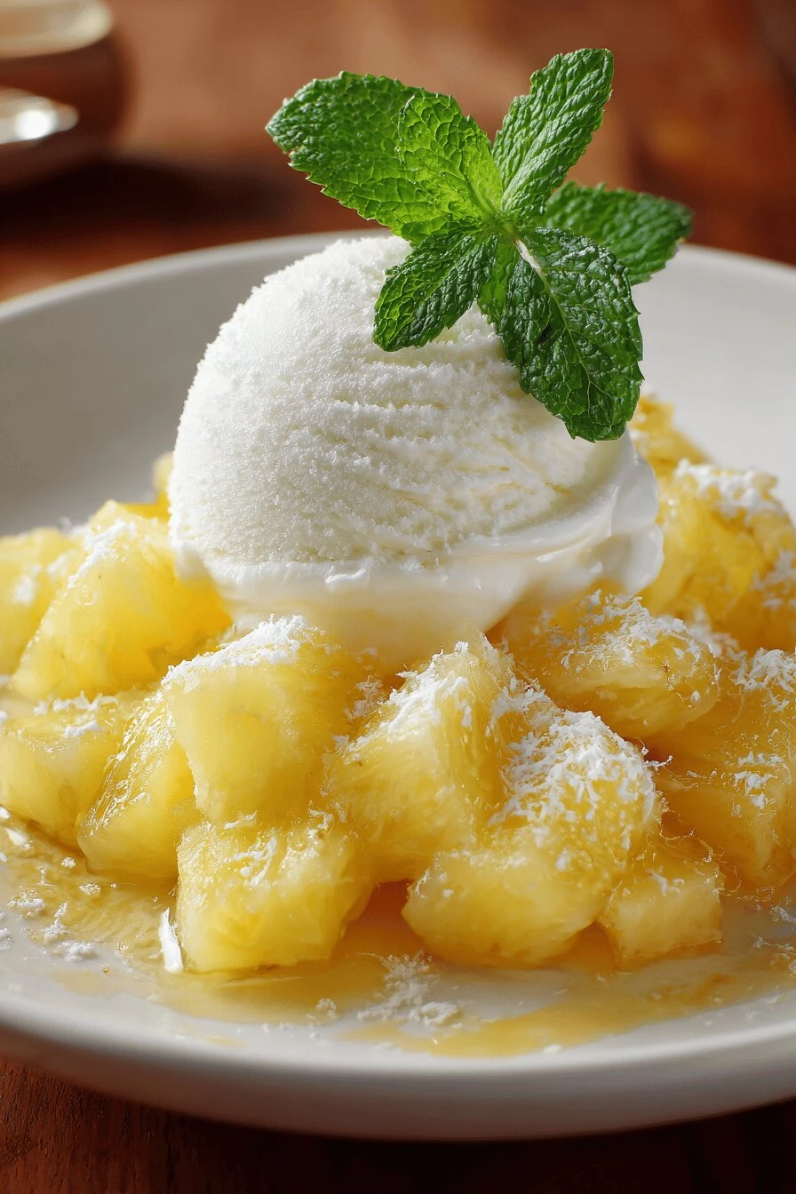 One large fresh pineapple—size matters here. Small ones are mealy. Pick one that’s heavy for its size, smells sharp. Honey. A tablespoon or so. Agave works. Maple works too. Just something to pull juice from the fruit. Lime. One small one. Zest it first, keep the zest separate, then juice it. The zest hits harder than you’d think. Vanilla ice cream. Store-bought is fine. Homemade is fine. Doesn’t matter as much as you think. Mint leaves, maybe. Finely chopped. Optional but it changes things—the peppery part wakes everything up. Basil would work too if you have it.