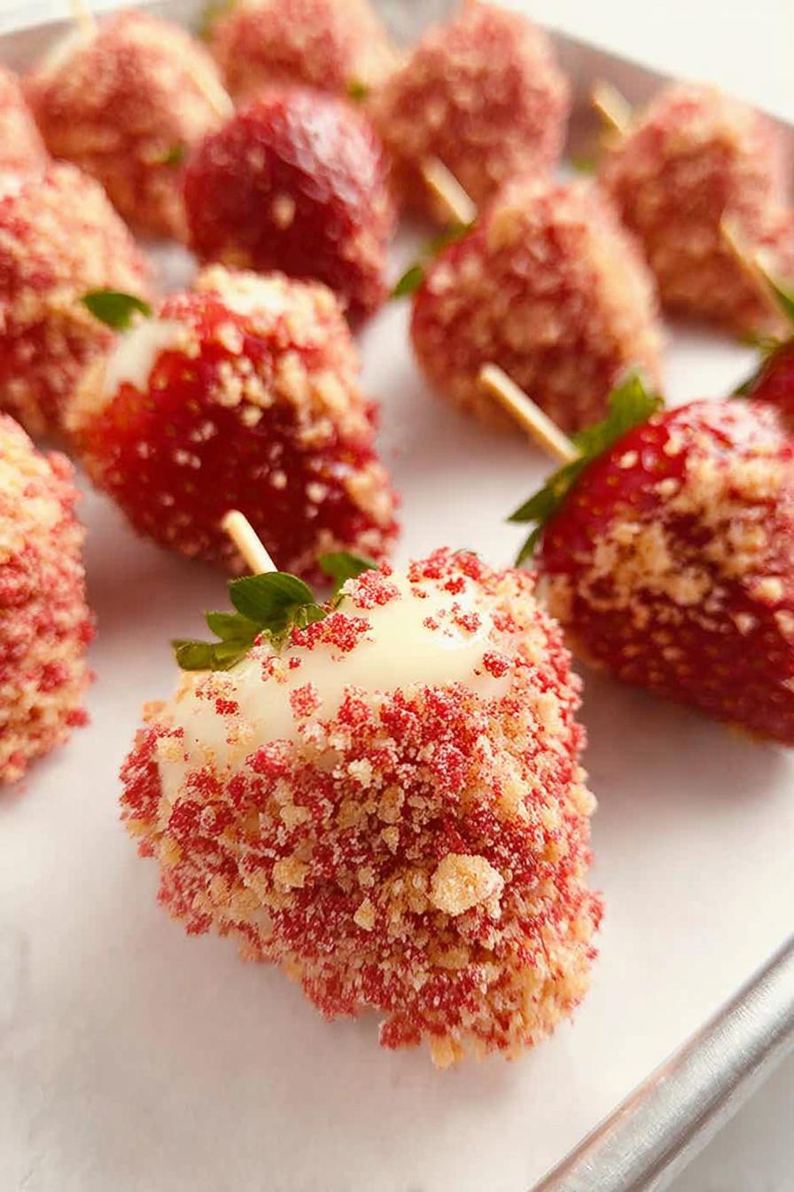 - Immediately roll or sprinkle strawberry shortcake crunch to coat melted chocolate fully. Hold to let excess fall off but don't scrape or it clogs texture.