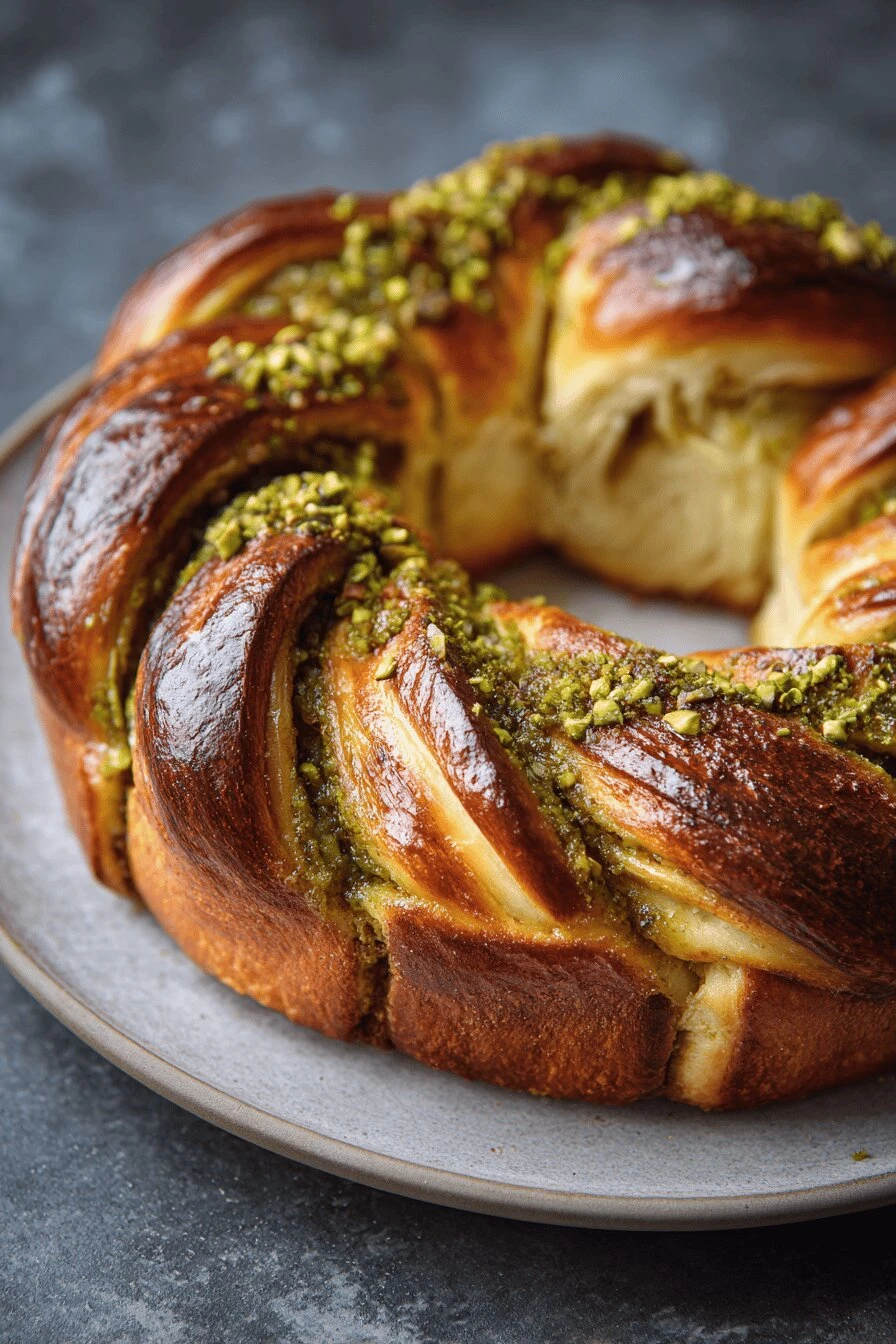 Flour, sugar, yeast, salt. Milk. Browned butter—that’s the move. Then pistachios mixed with honey and cardamom go right in the middle, twisted through so every slice has that green-gold swirl. Forty-five minutes to shape it, forty minutes in the oven. Done.