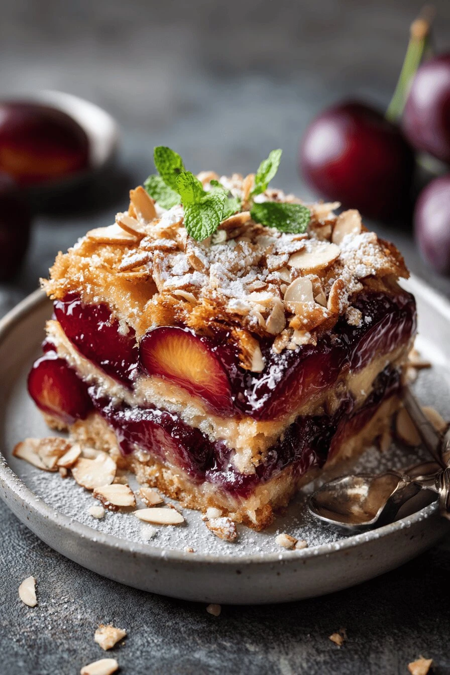 Ground almonds keep it tender underneath while sliced ones get actually crunchy. Two textures in one topping. Doesn’t happen by accident.