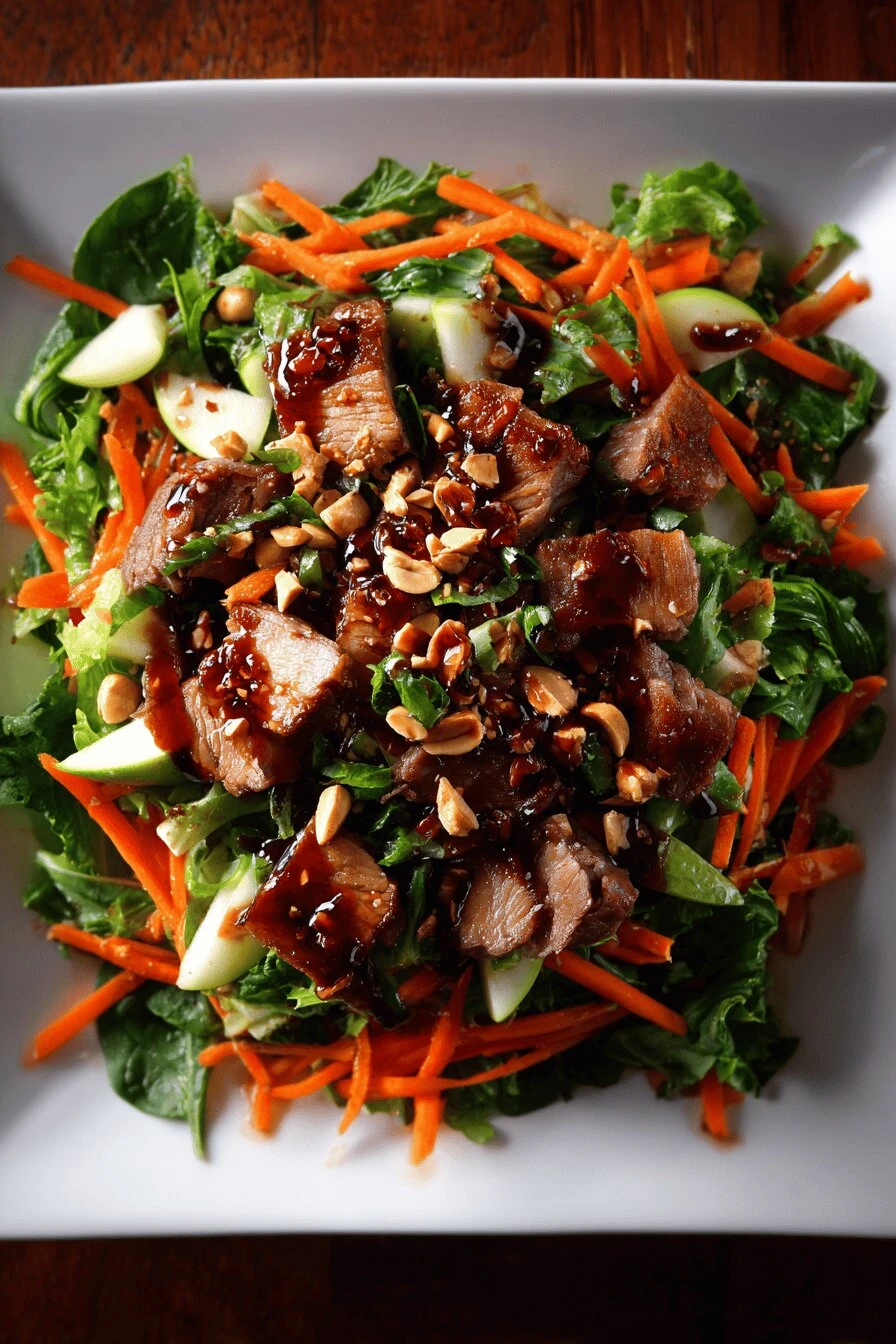 Comes together in under 1 hour 15 minutes flat. The pork is medium-rare inside, the bok choy stays bright and tender instead of sad, and everything gets pulled into this teriyaki dressing that tastes like you sweated over it for days. You didn’t. It’s basically one pot. Cold the next day if you have leftovers — better actually, because the flavors sit together overnight. Works as an easy dinner when you need something that looks like you tried but tastes too good to be true. Apple and carrots give this thing actual crunch. Peanuts on top. That’s the whole point.