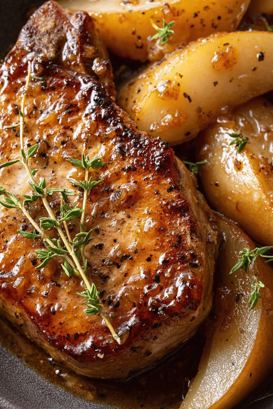 The whole thing cooks in one pan. Cleanup is basically nothing. Takes 60 minutes total — 25 prep, 35 cooking — and most of that’s just letting things do their thing while you stand there, honestly kind of watching. Main dish that feels fancy but isn’t. The glaze happens by itself once you understand the sizzle. Pork stays juicy because you’re not overcooking it. Pears turn into actual caramel — sweet, soft, almost melting into the sauce. Tastes like honey and thyme and that sharp hit of white wine vinegar all at once. The butter. The crust on the chops. Works cold the next day too, which is weird but true.