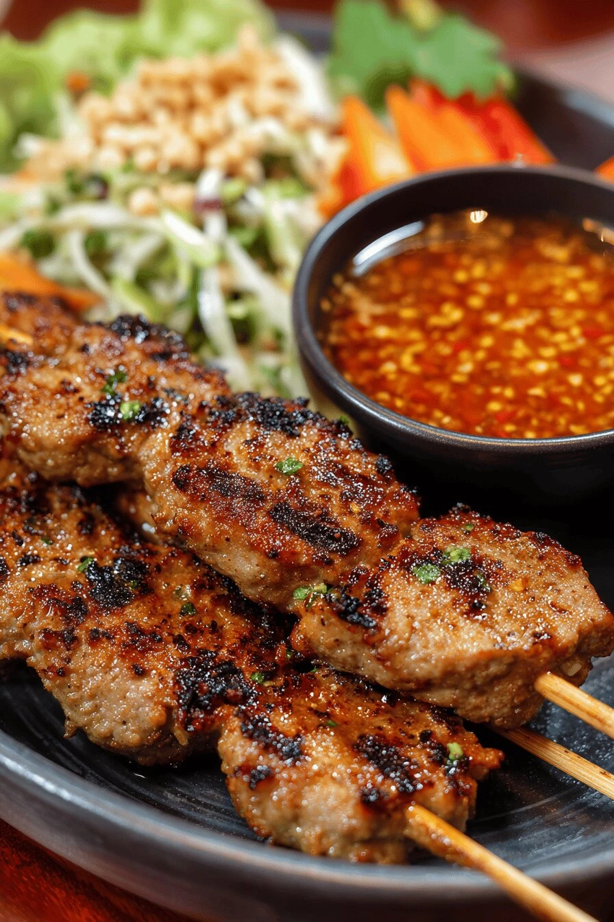 Hot grill. Wooden skewers soaked and ready. Pork mixture that actually sticks together instead of falling apart halfway through. That’s the whole thing right there—ground pork on a stick, coated in ginger lemongrass sauce that gets sticky and charred, with cashews in the dipping sauce because that’s what makes it work. Had a version of this at a street market in Bangkok, forgot about it for three years, then made it on a Tuesday with what I had. Turned out almost exactly the same.