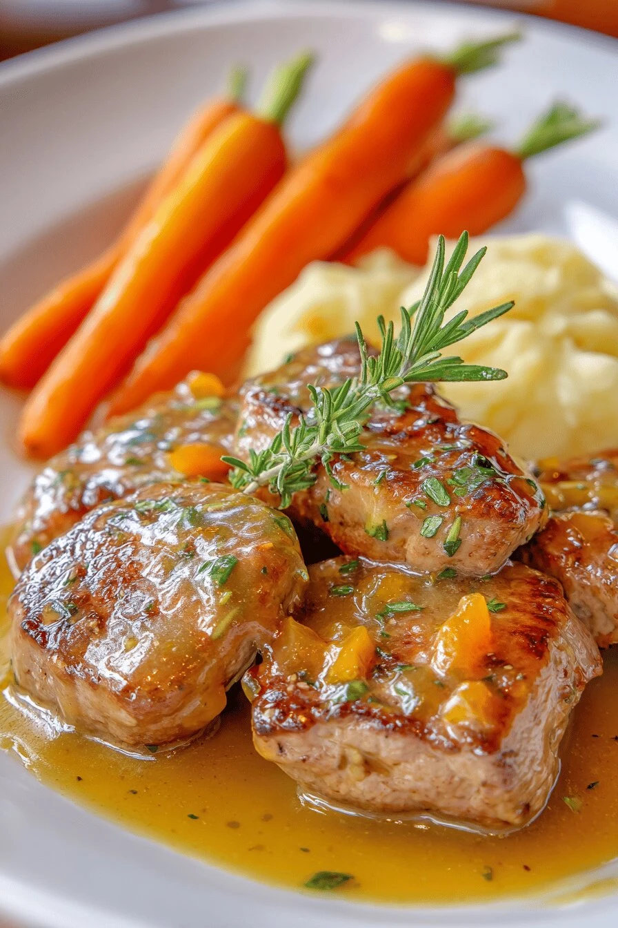 - 10 Serve medallions hot with pan sauce spooned over, alongside roasted baby carrots and garlic mashed potatoes.