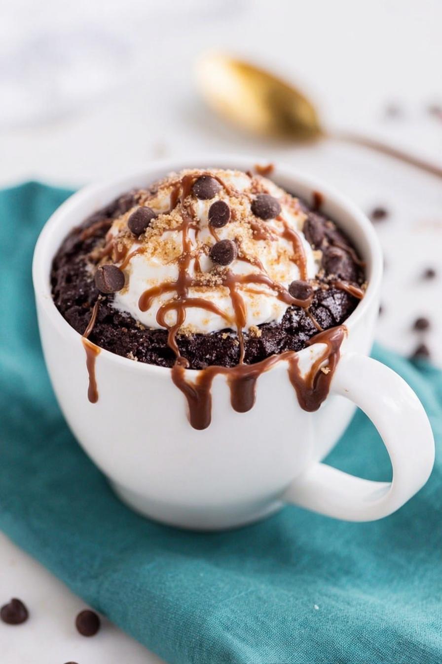 - Let sit a minute out microwave — fudgy texture firms up here. Add toppings while warm — nuts crackle, peanut butter melts. Eat straight out of mug. Use spoon to scrape corners; no crumbs left behind.