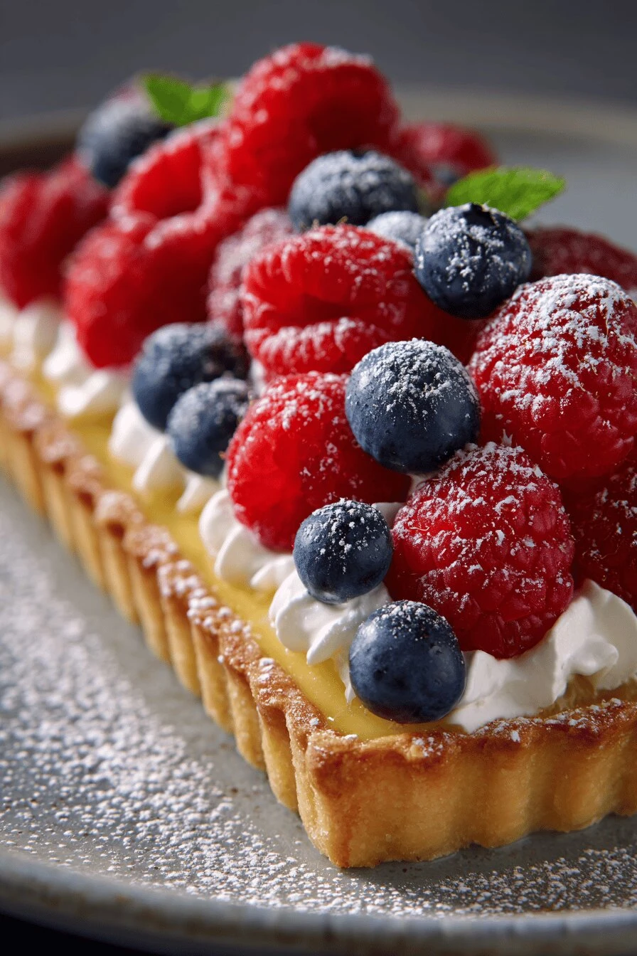 Chill the dough 45 minutes minimum. Roll it thin. Press into a tart pan with a removable bottom—this matters. Bake the crust first until the edges go golden but the base stays pale. This is the move. Then comes the filling—a lemon raspberry custard that thickens on the stove while you whisk constantly. Strain it through a fine sieve so it’s silky. Pour into the crust. Bake again, just 10-12 minutes, until the edges set but the center still jiggles slightly. Cool it. Chill it overnight if you can. Top with whipped coconut cream and fresh raspberries. Done.