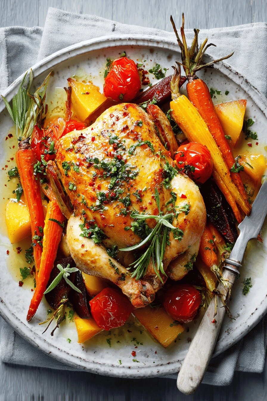 - 4 Scatter carrots, beets, tomatoes, garlic cloves, and rosemary sprigs around chicken. Salt veggies lightly, dust with chili flakes for subtle heat. Squeeze juice from remaining lemon half over vegetables, letting fresh citrus flavor brighten their sweetness during roast.