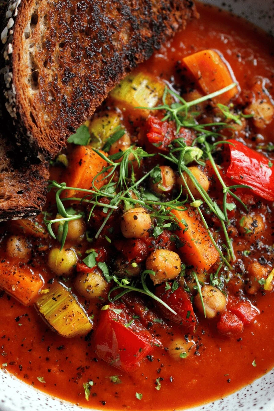 Red bell peppers. Not yellow, not orange. Red ones get sweeter when they roast. Two carrots sliced into half moons — thinner than you think, actually. One leek cleaned really well because dirt hides in there. Olive oil. 1.5 tablespoons. That’s enough. Chicken or vegetable broth, four cups. Fire-roasted diced tomatoes from a can — the roasting part matters, don’t sub regular. One can of chickpeas rinsed and drained. Fresh thyme leaves. A teaspoon. Not dried. Dried tastes like nothing. Salt. Black pepper. Rye bread sliced and toasted on the side — it’s not optional.