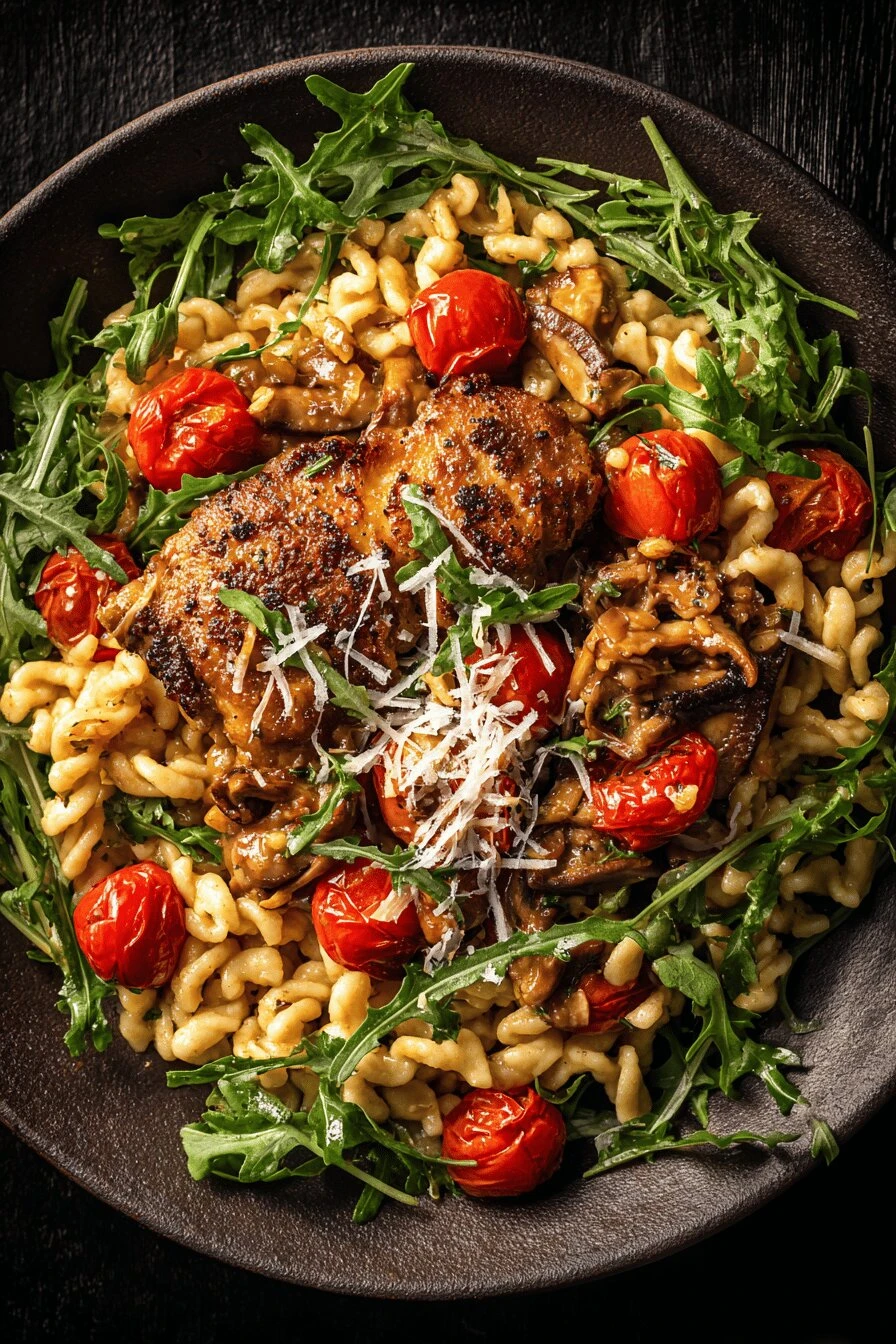 Takes 50 minutes total and tastes like you spent three hours on it. The chicken thighs stay actually juicy—not like breast meat, all dry and pointless. Mushrooms get deep and soft. Cherry tomatoes break down into this sauce that’s kind of sweet, kind of sharp depending on how ripe they are. Arugula at the end keeps it from being too heavy. And the pecorino—it melts into the pasta and ties everything together. Works cold the next day, maybe even better then. Not complicated. Just hot pan, good timing, sharp cheese at the end.