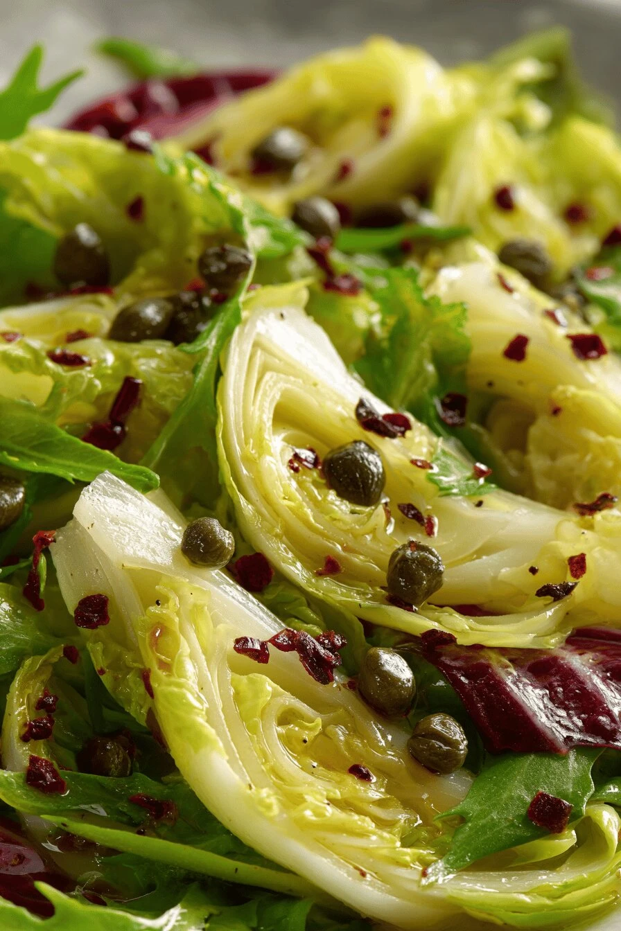 Toss the chicory with capers first, before the dressing. Capers are salty. They start breaking down the bitter edge a little bit, make it softer somehow. Then add dressing. Toss gently. Not aggressively. You’re trying to coat it, not bruise it.
