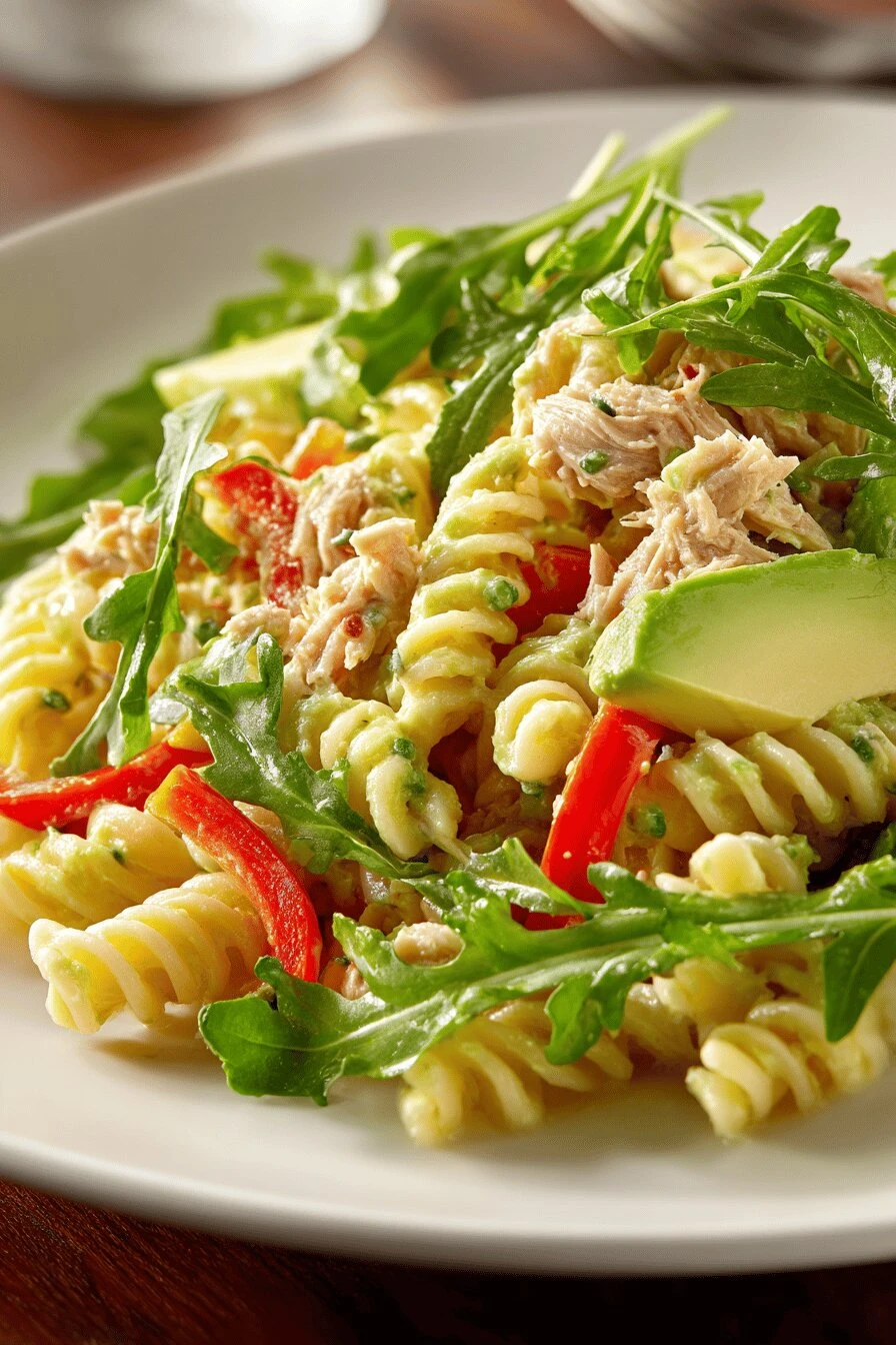 Don’t oversoak the green onion. Five minutes is right. Ten and it gets mushy instead of just mild. Warm pasta into the dressing is non-negotiable. Cold pasta won’t absorb anything. It just glides around in the mayo. Warm absorbs. That’s the difference. Lemon juice on the avocado the second you slice it. Not optional. Browning happens fast. Don’t mash the tuna to dust. You want chunks. Texture matters. If it seems dry when you fold the pasta in, add a bit more mayo. Not much. A tablespoon. Stir it. The salad sits fine for a few hours in the fridge but tastes best within 2 hours. After that the arugula gets soft and the avocado gets very soft.