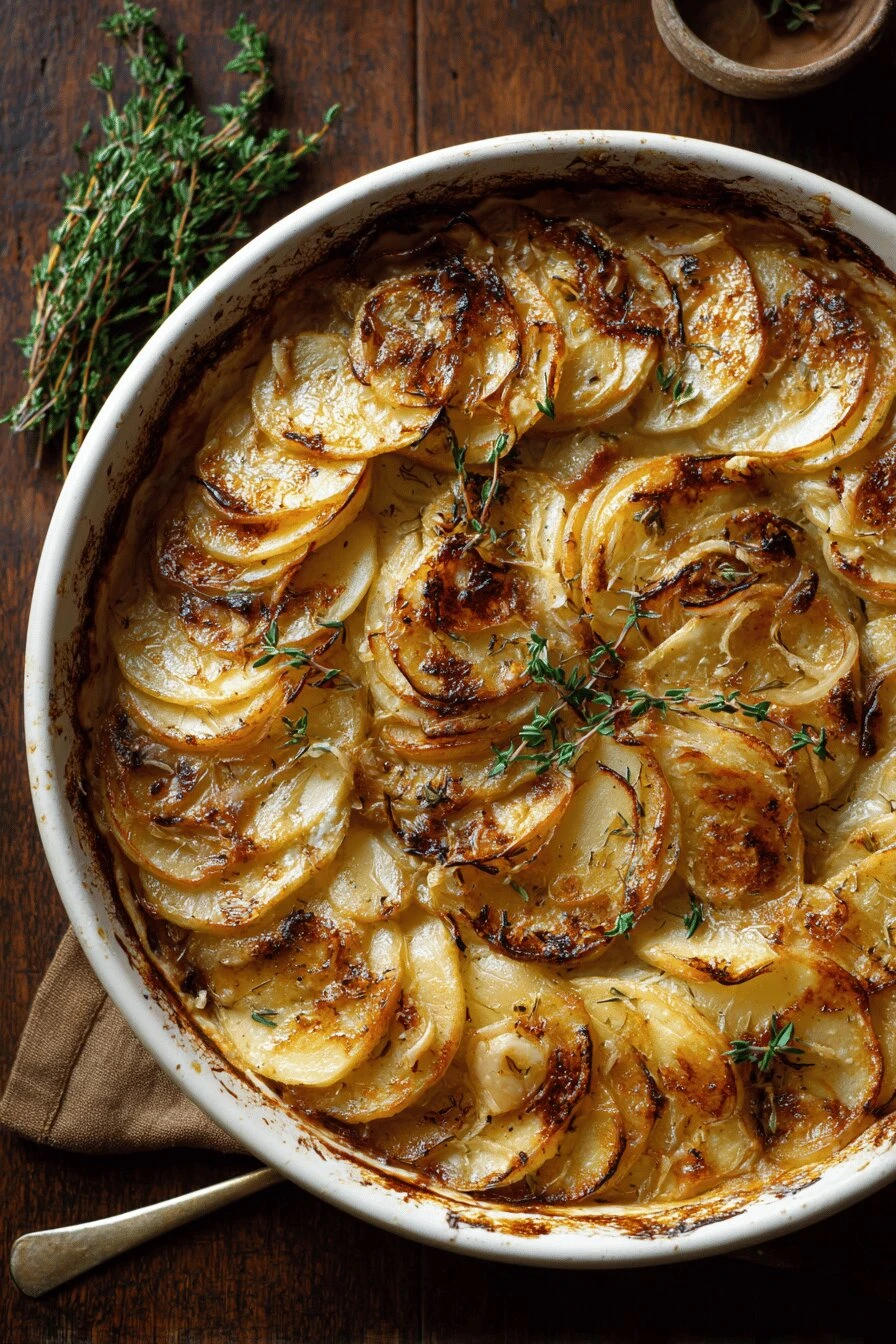 Takes 2 hours 50 minutes total but most of that’s the oven doing the work. Vegetarian. Actually filling as a side dish. Works cold the next day, maybe better. One buttered pan. Real butter. The edges get crispy in a way that matters. Layers of thin potatoes that go soft all the way through but don’t fall apart. The caramelized onion potato casserole angle here—onions turn sweet and deep without burning, which takes patience but works.